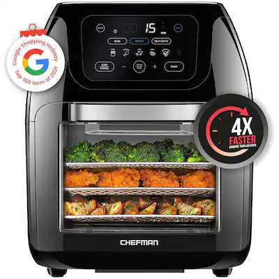 Customers have good things to say about the 12.6-qt. Touchscreen Air Fryer Pizza Oven with Rotisserie, particularly its ease of use and overall cooking performance. Many appreciate its size and capacity for preparing meals, as well as the helpful design features like the rotisserie and light. Some customers have noted minor issues such as occasional fan noise and small touchscreen buttons, while a few have reported a noticeable smell during use.$129.99