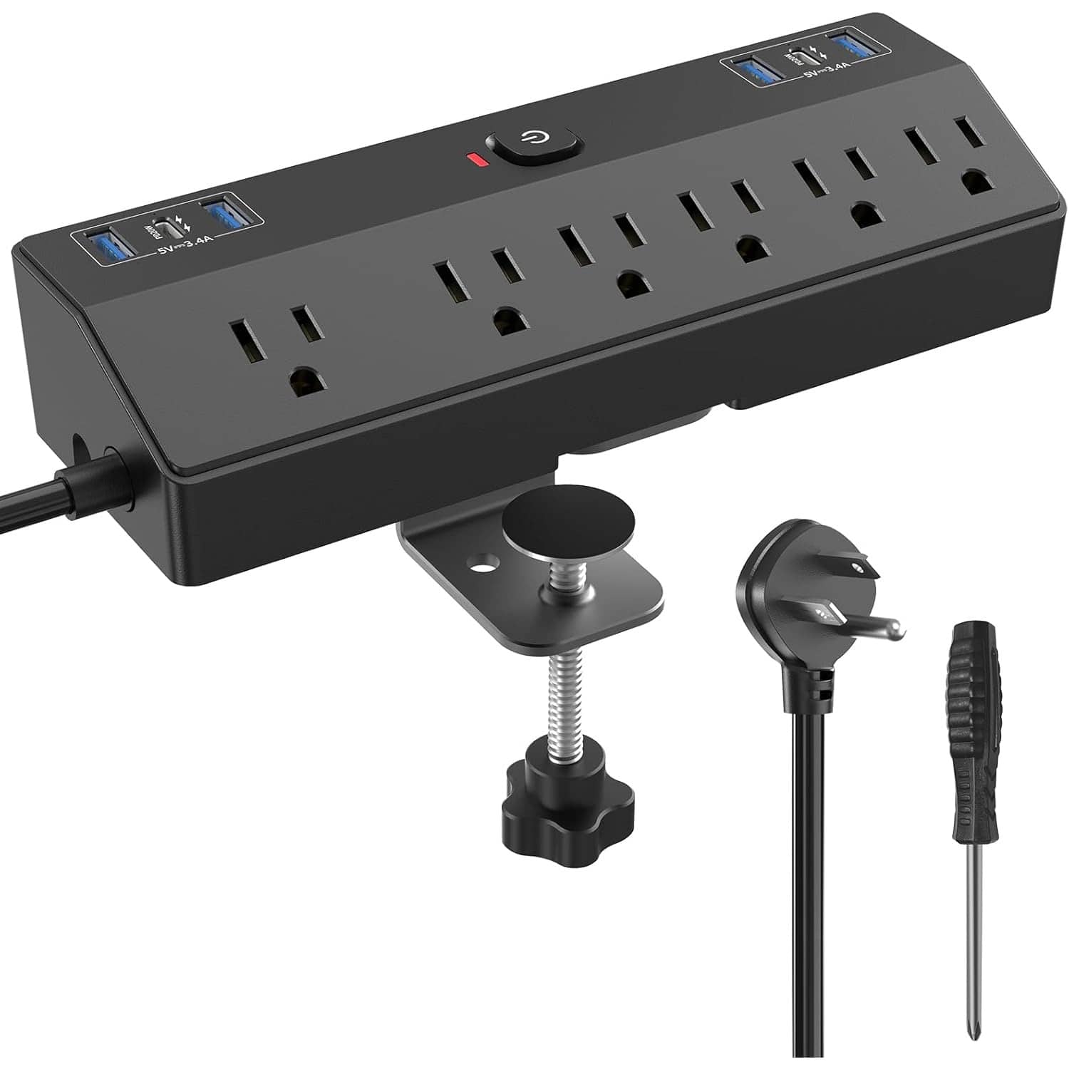 Desk Clamp Power Strip with 3 Outlets, USB Charging, 6.5FT Cord, Desktop Mount for Home, Office, or Workshop