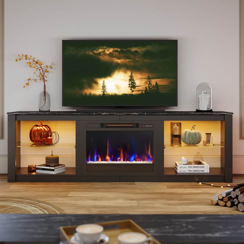 72.8 in. Black TV Cabinet with Glass Electric Fireplace Adjustable LED Light Colors Media Console for TVs up to 80 in.
