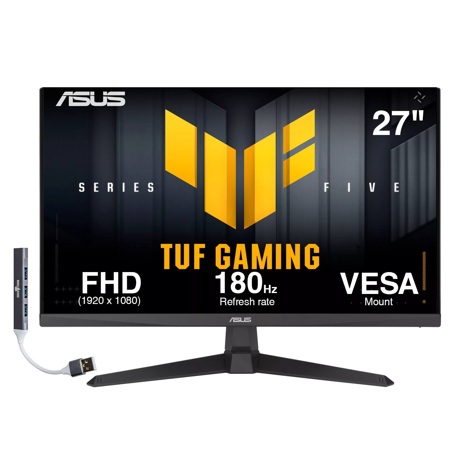 This 27-inch flat IPS monitor delivers a smooth and immersive viewing experience with an FHD (1920 × 1080) resolution, 16:9 aspect ratio, and an ultra-fast 1ms (GtG) response time paired with a 180Hz refresh rate for fluid motion. It features 99% sRGB color gamut support, 16.7 million colors, 8-bit panel depth, 250 nits brightness, and a 1000:1 contrast ratio for vibrant and accurate visuals. Designed for comfort, it includes Flicker-Free technology, Eye Saver Mode, wide 178° viewing angles, and AMD FreeSync for tear-free performance. The monitor supports HDCP, VESA mounting (100 × 100 mm), and offers versatile connectivity with two HDMI ports, one DisplayPort, and a headphone jack, along with built-in 2 × 2W speakers. Finished in black, it measures 24.21 × 7.60 × 17.83 inches, weighs 10.1 lbs, supports tilt adjustment from -5° to +23°, and comes with a special edition Dockztorm USB Hub providing high-speed data transfer up to 5Gbps.