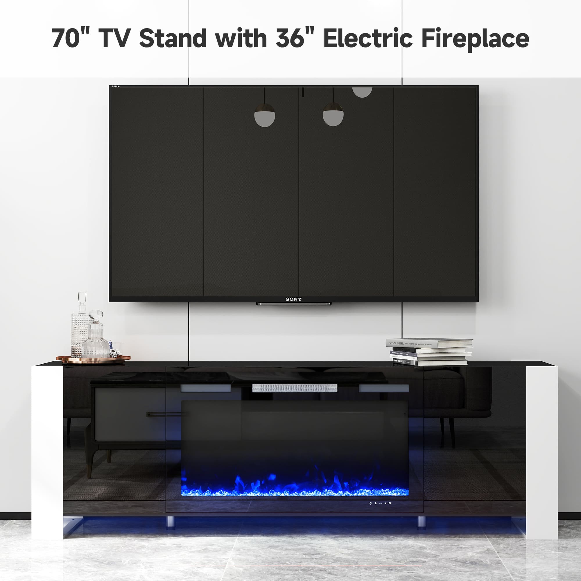 Elevate your home theater with this 70-inch marble-black TV stand, designed to support TVs up to 75". It features a customizable 36" electric fireplace with 5 flame colors and remote control, perfect for setting a cozy mood. The versatile storage combines both open shelves and closed cabinets, ideal for media consoles like a PS5 or decor. Built from sturdy yet lightweight materials, this unit offers both luxury and durability—and comes with easy assembly and helpful customer support.