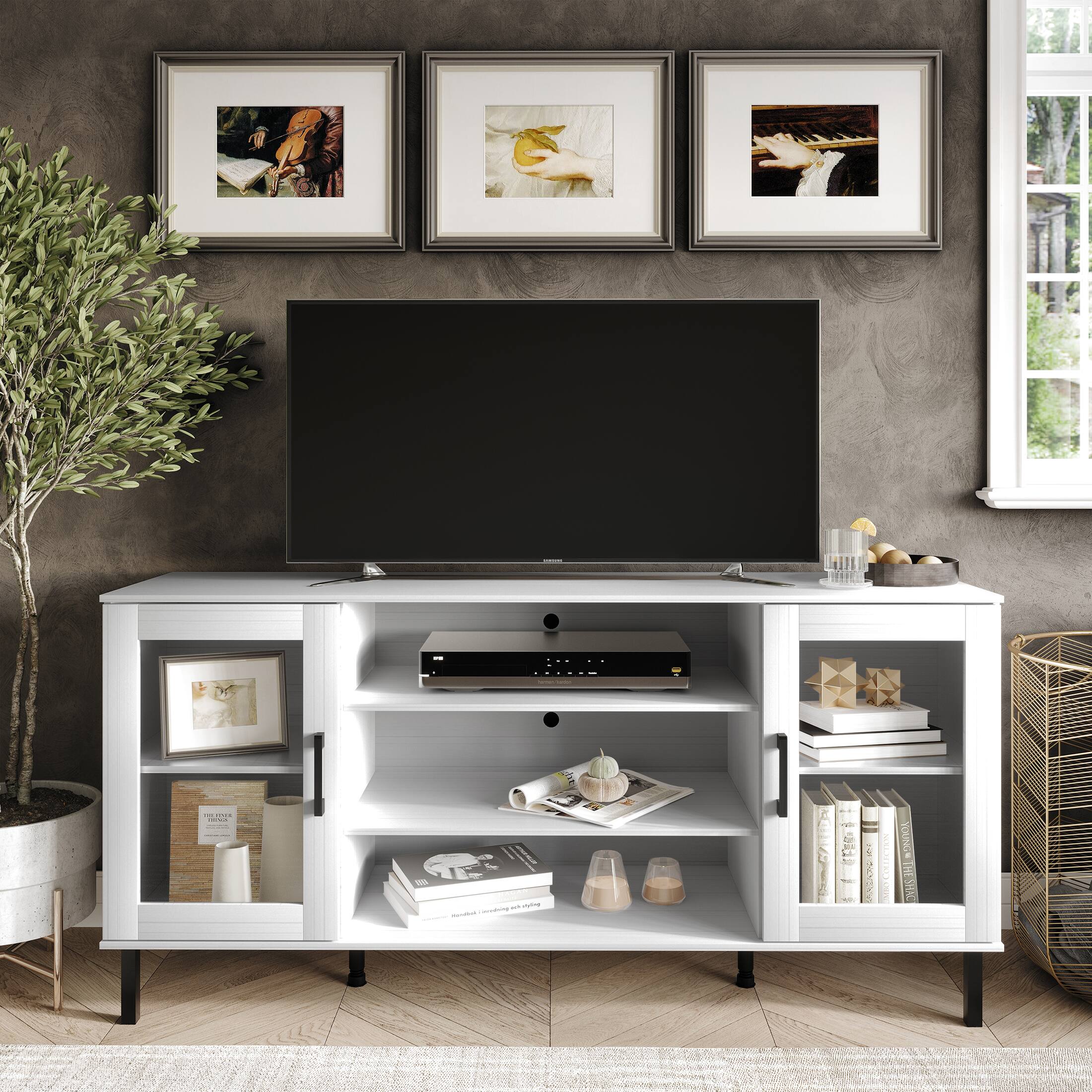 Transform your space with our modern TV stand, designed for contemporary living. The spacious 60-inch top surface fits TVs and decorative items with ease. Keep your media organized on three shelves featuring cable management holes. Cabinets with sleek acrylic doors and black handles add a touch of sophistication. Supported by sturdy legs and center supports for lasting stability. Available in black and white to suit various décor styles. Assembly is simple with included instructions, and it ships in one box. Upgrade your entertainment area with this stylish and practical piece.