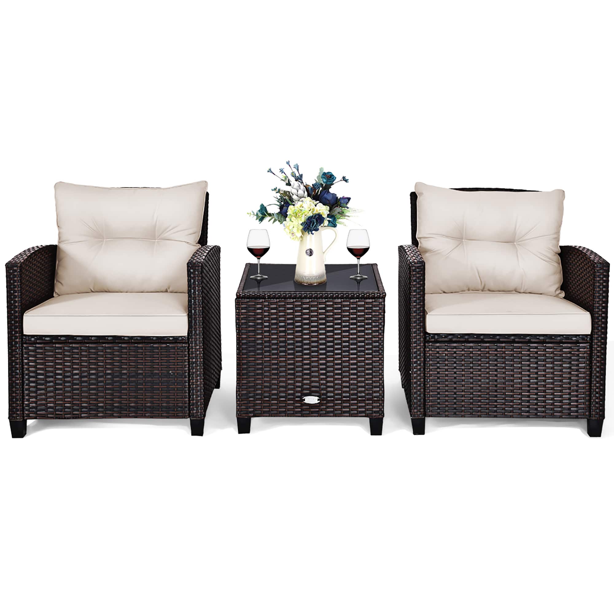 Do you want to drink coffee or have a break with your friend in your garden, patio or yard? Have you found suitable sofa set? Our 3-piece outdoor rattan furniture set is a good choice for you. Made of sturdy steel and premium rattan, the sofa set is sturdy and sturdy which can be used for long time. Comes with a tempered glass top table, not only can you place some drinks or snacks on hard tabletop to take conveniently but also some decors like vase can be put on the tabletop. The sofas are equipped with back and seat cushion which will give you excellent comfort. And the cover of cushion has zipper for removing and rinsing easily. It's perfect to relax and enjoy time with your friends and family.