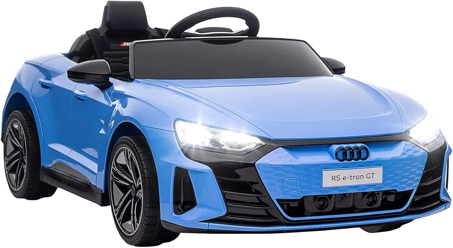 Let your little one have lots of fun with this officially licensed Audi RS e-tron GT ride on car. Kids can drive the car manually by operating the steering wheel and stop freely by releasing foot pedal. Parents can also operate this toy car via the 2.4G remote control. Meanwhile, 2 powerful motors and 12V battery offer a speed of 3-5 km/h. Crafted from quality PP material and metal, this kids ride on car is durable for long term use. In terms of security, the large seat with safety belt, 4 solid wheels with suspension springs, double lockable doors and slow start design allow your kids to confidently explore the world. Working features LED lights, built-in music and vivid horn bring a lost of fun. This kids car toy has MP3 interface, USB port and TF card slot to connect external devices. With cool and stylish look, the battery powered ride on car will be a perfect gift for kids aged 37-95 months old.