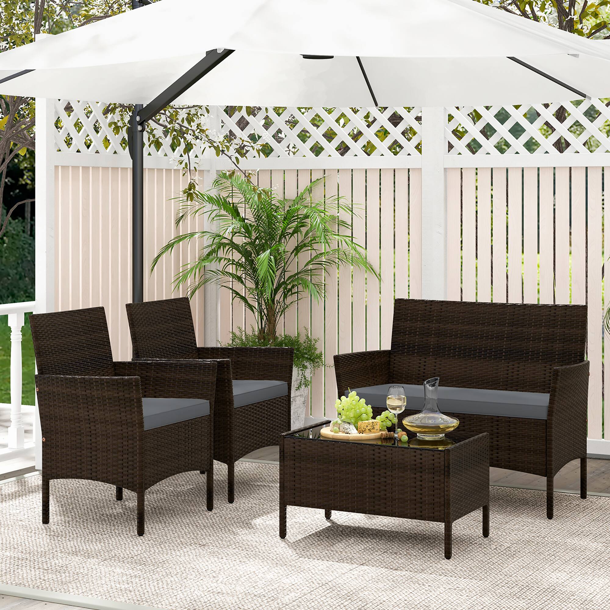 Delivery of this item is restricted to drop-off onlyIf you are looking for a sofa set for your outdoor space,our 4 pieces rattan furniture set is an ideal choice. Constructed with high quality steel and tight rattan,this set is Sturdy enough to serve you for a long time. There are thick cushions on the seats,providing you with a comfortable sitting experience. Covers of these cushions can be taken off because of zipper design. Moreover,you can have a good coffee time with the coffee table which can hold drinks and snacks. Our sofa set is suitable for outdoor places,such as garden,poolside and patio. Take it home and have a good time with our sofa set!