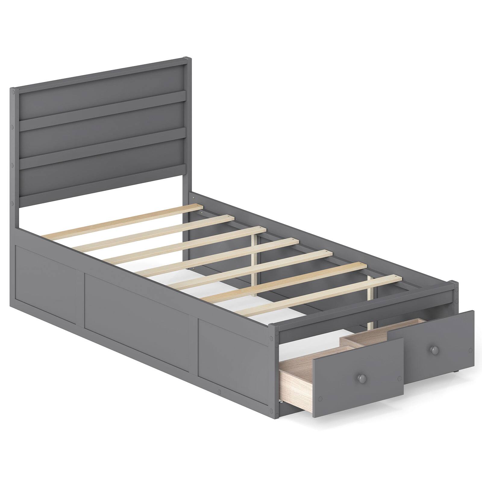 Delivery of this item is restricted to drop-off onlyElevate your bedroom with this sleek platform bed, featuring a tall, modern headboard that instantly catches the eye. Enjoy a clutter-free space thanks to 2 roomy underbed drawers, which are perfect for neatly tucking away bedding and clothes. The robust, slatted construction and solid wood legs ensure unbeatable mattress support and promote airflow for a fresher sleep experience. A fully enclosed base keeps mess at bay, making cleaning a breeze. No box spring is required; simply place your favorite mattress (up to 8 inches thick) on the anti-slip surface for nights of undisturbed comfort.