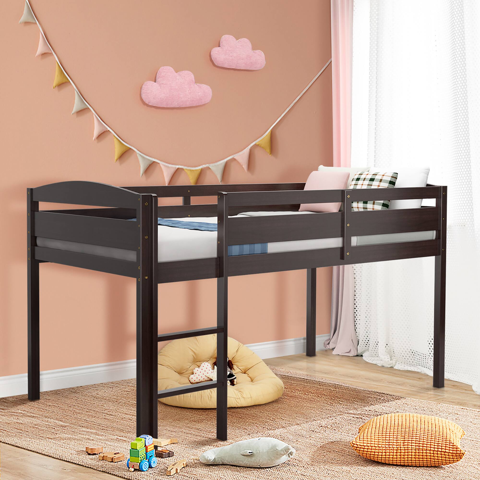 This bunk bed is designed to give kids a safe & convenient sleep experience. Made of powder-coated metal slats, the bunk bed ensures a Sturdy and stable construction for long-term use. The slatted floor bed frame not only provides excellent support, but also eliminates the need for a box spring. Moreover, the low profile twin over twin design of this bunk bed maximizes the floor space while providing comfortable sleeping arrangements for your kids. Featuring a convenient ladder and full-length guardrails, this bunk bed provides easy access to the top bunk while ensuring safety during sleep. Besides, the twin over twin bunk bed offers a practical and sleek solution for any living space.