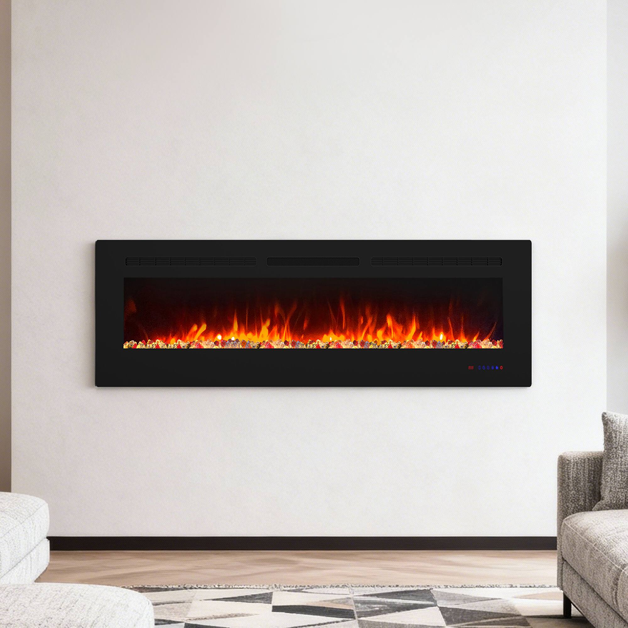 Bring warmth and modern style to your living space year-round with this 50-inch Smart Recessed Wall Mounted Electric Fireplace. Designed for versatility, it can be mounted, recessed, or used freestanding, making it a perfect fit for any room. The fireplace delivers powerful 750W–1500W heating for spaces up to 400 sq. ft., with an adjustable thermostat ranging from 62°F to 99°F for personalized comfort.Enjoy an immersive flame experience with 13 flame colors and 13 fuel bed colors, offering up to 169 flame combinations visible through clear tempered glass. Even without heat, the LED flame display creates a cozy ambiance. For safety and convenience, this ETL-certified electric fireplace includes overheat protection and a remote control with a 20 ft range and APP to easily adjust heat, flame, and timer settings.