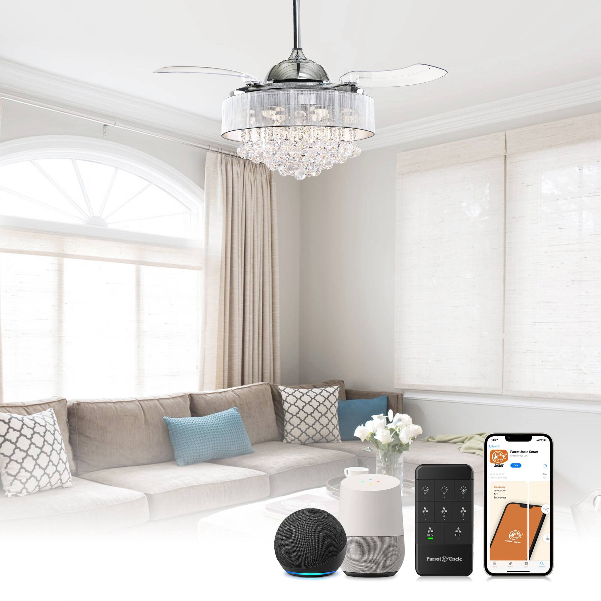 This modern bubble acrylic caged ceiling fan combines style and function in a compact design. Featuring three durable ABS blades and a reversible DC motor, it delivers powerful yet quiet airflow, perfect for small rooms up to 75 sq. ft. The included handheld remote allows easy control of 3 fan speeds and lighting. With three energy-efficient G9 LED bulbs (3000K warm light), ETL certification, and a flush mount installation, this fan is an ideal choice for bedrooms, kitchens, and other small living spaces.
