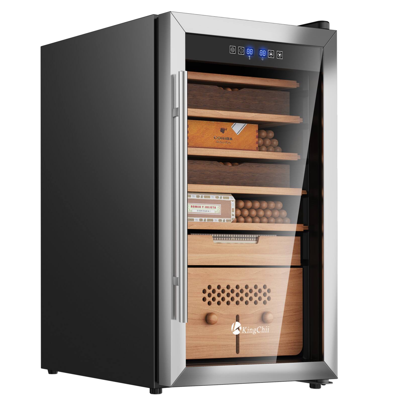 This compact cigar humidor is designed to provide a stable and controlled environment for cigar storage. The interior features natural wood shelving that supports humidity balance and helps preserve aroma, while the built-in hygrometer allows easy monitoring of internal conditions. With a cabinet-style design and precise temperature control, this unit is suitable for home or office use where consistent cigar storage conditions are required.