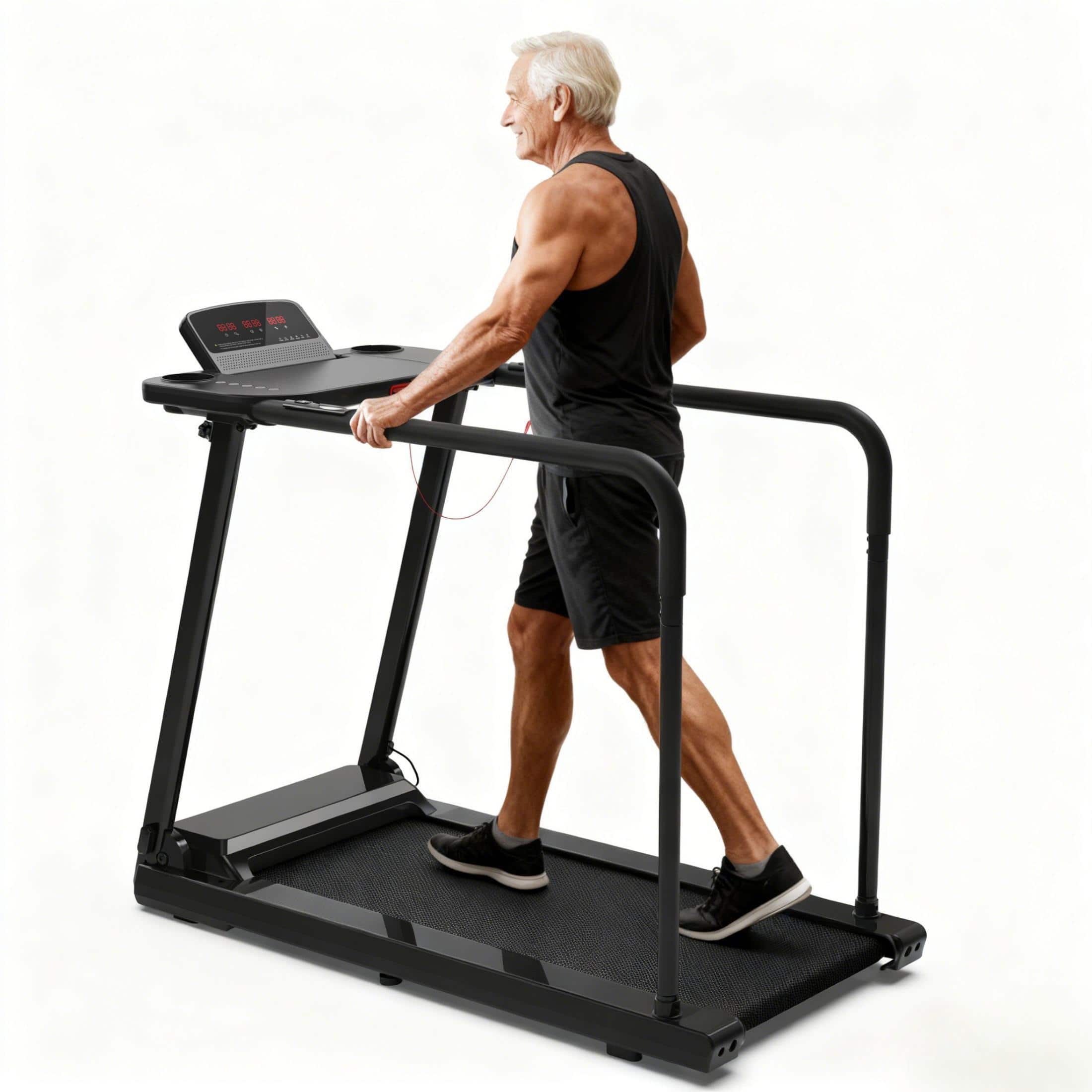 Stay active safely and confidently with Redliro senior-friendly treadmill - designed for older adults and recovery users. With extended side and front handrails, a 300 lbs weight capacity, and an emergency safety key, it offers maximum support and peace of mind. The quiet 2.5HP motor runs from 0.3 to 5.5 MPH, perfect for walking or light jogging. Easily track your progress with a large LED display and built-in heart rate sensors. Handrail speed controls and a gentle 0–2% manual incline make workouts simple and effective. When you're done, just fold it up and roll it away. Safe, quiet, and space-saving, ideal for low-impact home fitness.