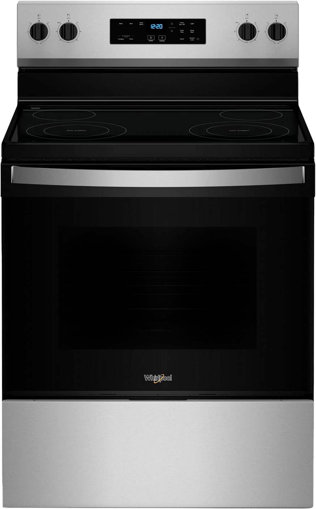 Prepare giant feasts efficiently with this GE freestanding electric double oven range. The steam-cleaning feature helps minimize maintenance, and the extra-large oven capacity fits large pans or multiple dishes. This GE freestanding electric range has a delay-bake option for your convenience.