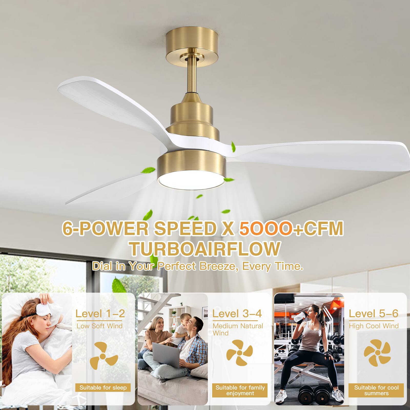 Featuring three aerodynamically optimized ABS blades, this contemporary ceiling fan delivers powerful airflow while enhancing your room's modern aesthetic. The included adjustable downrod (5/10/24 inches) ensures perfect installation for any ceiling height, from standard rooms to vaulted spaces, providing optimal air circulation wherever it's placed. Engineered with a high-efficiency DC motor, this fan operates at whisper-quiet levels while delivering strong, consistent airflow. Enjoy customizable comfort with 6 precise speed settings and reversible rotation - cooling in summer and circulating warm air in winter. Energy-saving technology reduces power consumption by up to 70% compared to traditional fans.Take control of your comfort with three convenient timer settings (1/4/8 hours). Perfect for bedtime use, daytime circulation, or energy savings, this intelligent feature automatically shuts off the fan while maintaining your preferred settings in memory for next use.The integrated 18W LED light offers three adjustable color temperatures (warm white 3000K, cool white 4000K, daylight 6000K) to create the perfect ambiance for any occasion. Easily control both lighting and fan functions with the included multi-function remote - adjust brightness, change light colors, and set fan speed from anywhere in the room.