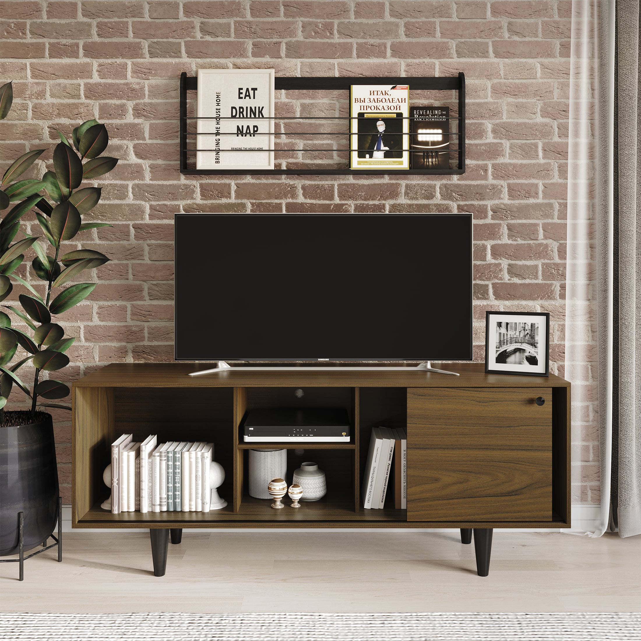 This tv stand brings a bold blend of rustic charm and industrial strength to your space. A wide top supports your 55-inch screen, while open shelves and roomy compartments keep gear organized. Reinforced metal framing and safety features create a reliable centerpiece for a clean, stylish setup.