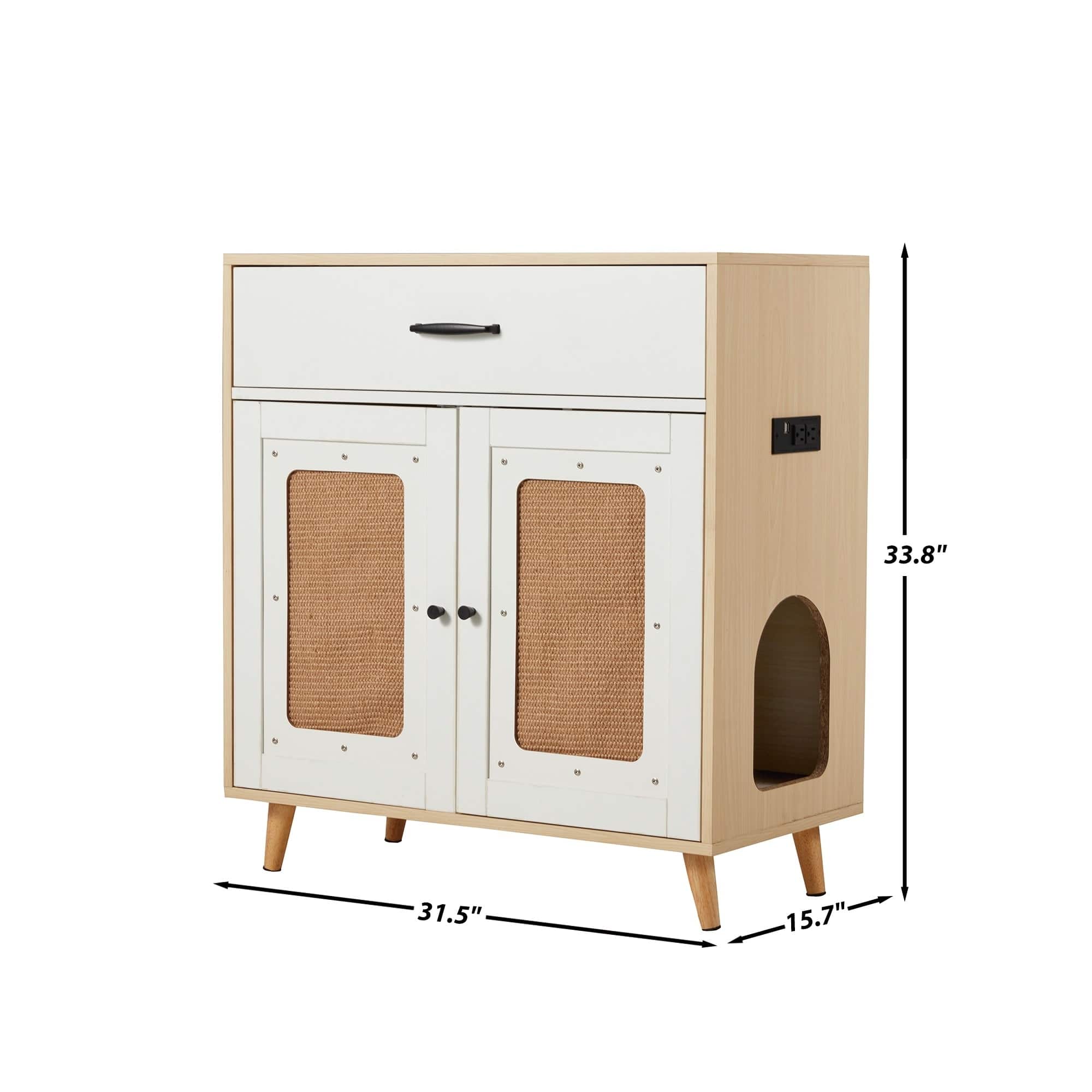 This modern cat litter cabinet combines style, functionality, and durability for any home. Made from thickened particleboard, it offers a spacious interior that fits most litter boxes and a large side door for easy cat access. Built-in ventilation keeps the cabinet fresh, while the sisal-covered door doubles as a scratching post. The extra-large drawer provides convenient storage for cat supplies and household items. Sturdy construction, easy assembly, and versatile use as a living room, bedroom, or entryway cabinet make this hidden litter box enclosure both practical and stylish.