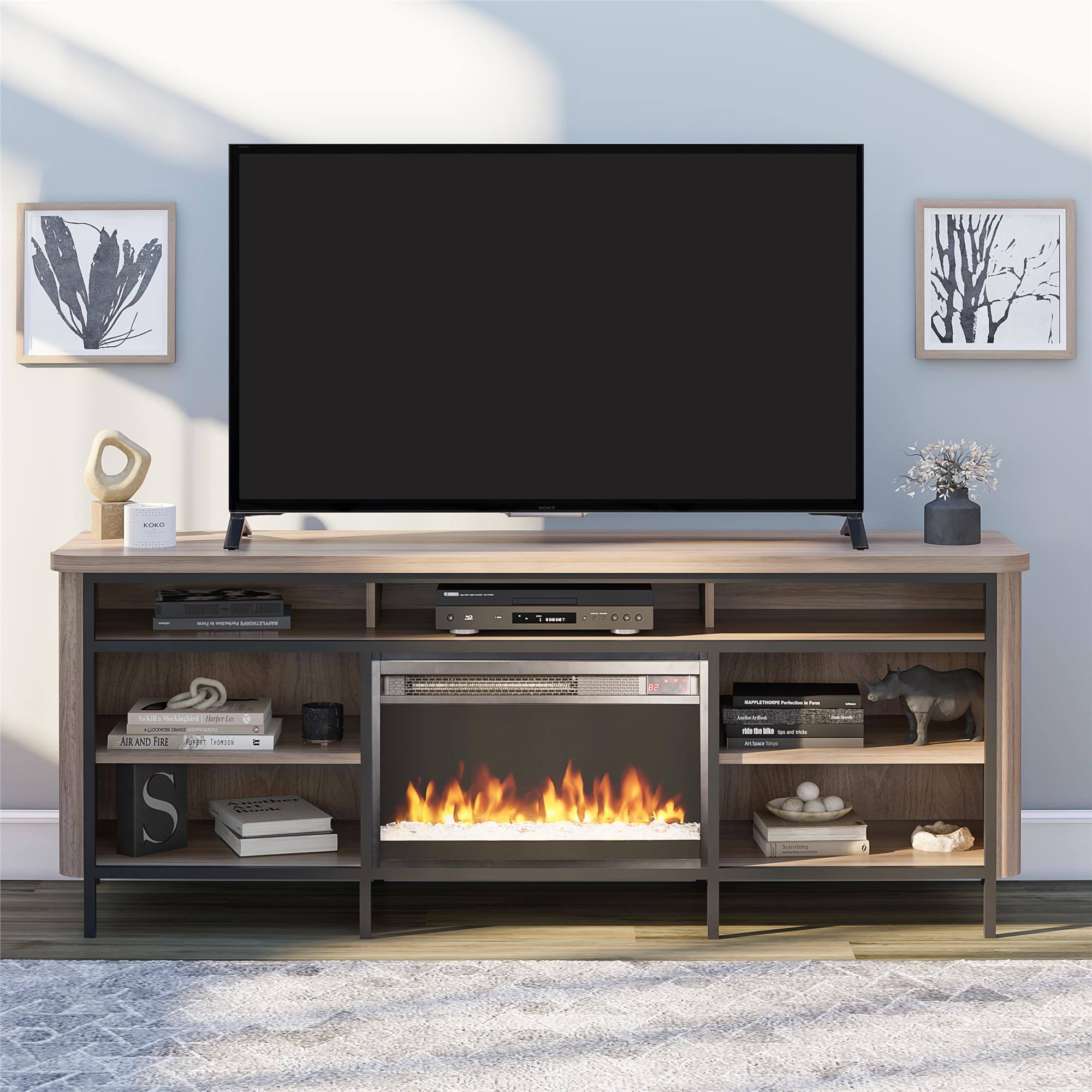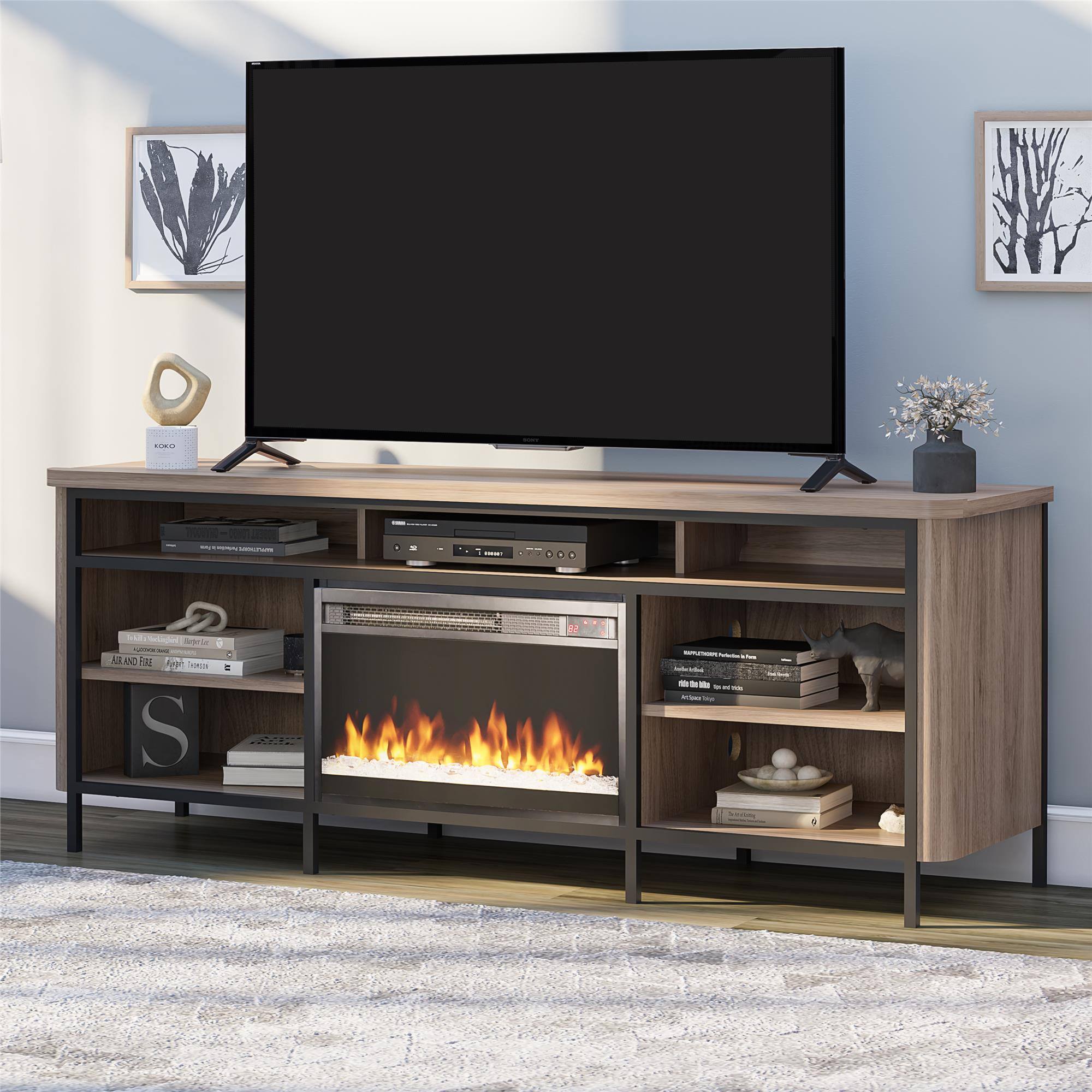 Make the living room the family gathering place once again with the Ameriwood Home Danton Electric Fireplace TV Console for TVs up to 75". This midcentury modern TV Stand can accommodate most TVs up to 75” wide or up to 145 lbs. The classic walnut finish on the laminated MDF and particleboard pairs with the black metal frame for a trendy industrial, yet midcentury modern appeal. The 23” electric fireplace insert adds to the style with the realistic flame effect and crystal feature. The insert can be used with or without heat to enjoy the ambiance in any weather, season or climate. Control the various flame and heat settings with the remote control or touch panel. The insert plugs into a standard 120V outlet and heats a room up to 400 square feet. The 7 open compartments can hold your components, audio equipment and gaming consoles. The top 3 shelves are set back to accommodate a sound bar, while the shelves below offer 2 adjustable shelves, and 2 fixed for customization of storage. Pass throughs for wires on the top tier, as well as built in wire management holes in the back of the unit, help keep your cords tangle free and make plugging in devices simple. The Fireplace TV Stand ships flat to your door and requires assembly upon opening. Two adults are recommended to assemble. Once assembled, the TV Stand measures to be 26.4” H x 67” W x 19.7” D.