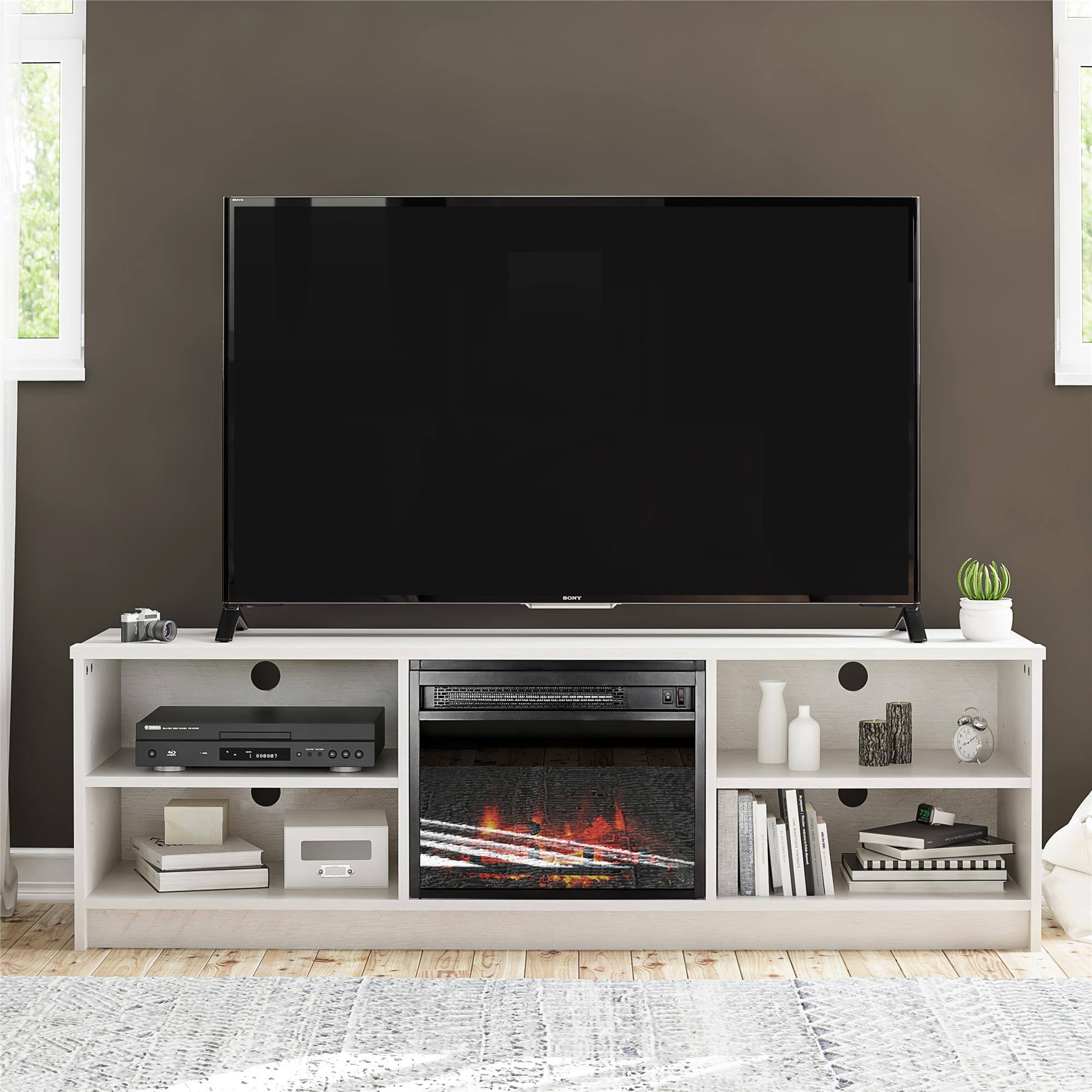 Dial in your perfect level of cozy, no matter the weather, with a 65” TV Stand with Electric Fireplace. The 18” electric fireplace insert is a great way to keep your room (up to 400 sq. ft.) warm or to create the perfect ambiance for the evening. The Fireplace and TV Stand has plenty of open storage. 4 shelves with adjustable shelving keep your entertainment components organized with built-in wire management to keep cords tangle free. The TV Stand accommodates most 65” flat panel TVs with a maximum weight of 120 lbs. Made from laminated engineered wood, this Fireplace TV Console is both elegant and affordable. The TV Stand ships flat in one box and requires assembly. Two adults are recommended to assemble. Once assembled, the TV Console measures to be 59.61” W x 15.79” D x 18.7” H.
