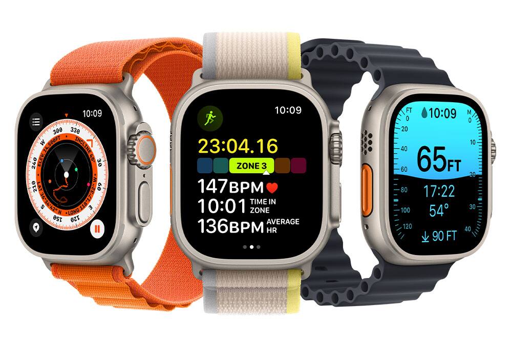 *Apple Watch SE and Apple Watch Series 9 have a water resistance rating of 50 meters under ISO standard 22810:2010. This means that they may be used for shallow-water activities like swimming in a pool or ocean. Apple Watch SE and Apple Watch Series 9 should not be used for scuba diving, waterskiing, or other activities involving high-velocity water or submersion below shallow depth. Apple Watch Ultra 2 has a water resistance rating of 100 meters under ISO standard 22810 and may be used for high-speed water sports and recreational scuba diving (with compatible third-party app from the App Store) to 40 meters. Should not be used for diving below 40 meters. Water resistance is not a permanent condition and can diminish over time. For additional information, see support.apple.com/HT205000. Apple Watch Series 9 and Apple Watch Ultra are also rated IP6X dust resistant.