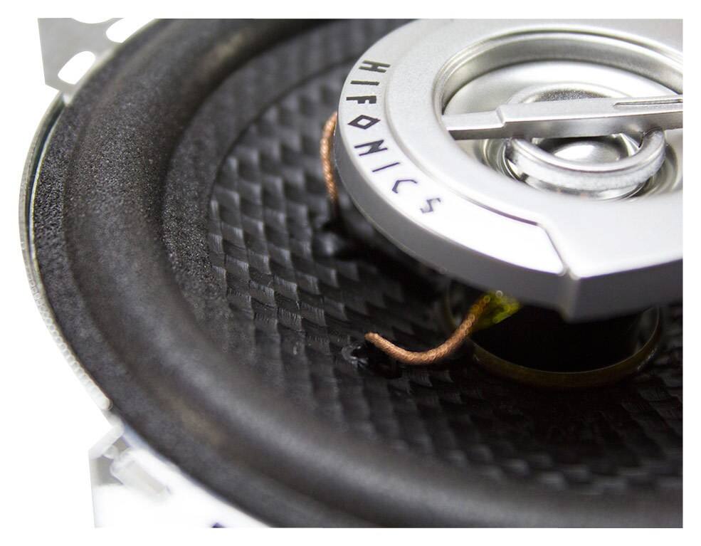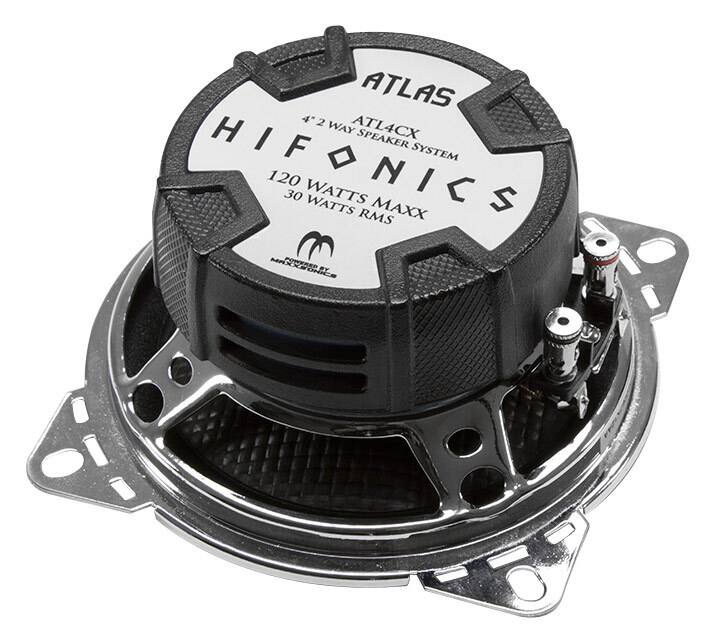 Enhance your car audio system with these Hifonics Atlas ATL4CX coaxial speakers that feature 4" injection-molded polypropylene-carbon-fiber woofer cones and 3/4" silk-dome tweeters, helping to ensure clear reproduction across a gamut of frequencies.