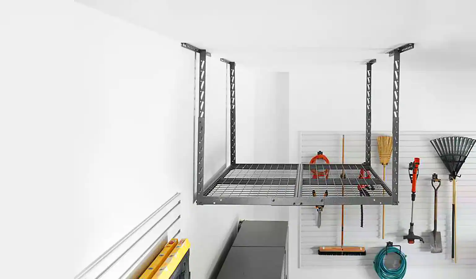 A garage is often more than just a place to park the car. In many homes, the garage is also an important storage space for power tools, electric bikes, lawn mowers, leaf blowers, holiday decorations, sports equipment and more. For some, the garage is even a workout room or a workshop for carpentry or other projects. With so much potential, it’s easy for garages to end up cluttered and messy. To prevent this, you will want well-designed garage storage shelves and cabinets and a plan for how to organize your garage to suit your needs. If you want to fit a personal gym space into your garage, take measurements before you pick your garage exercise equipment. You’ll want to make sure you have plenty of room if you’re choosing something large, like an elliptical or rowing machine. If you don’t have much space, you can still put together a compact strength training collection with some weights and resistance bands.