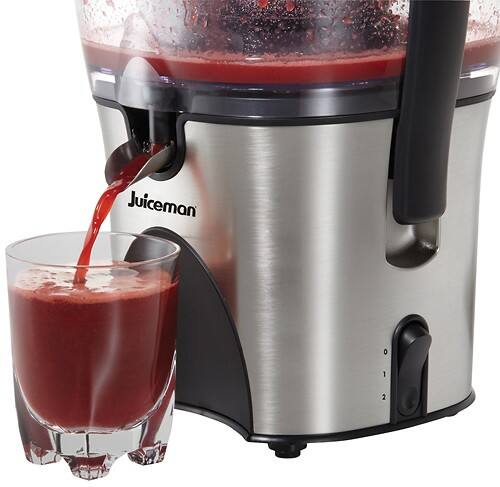 Enjoy a delicious beverage with help from this Juiceman JM480S juicer that combines the power of an automatic juice extractor and a citrus juicer to juice your favorite fruits and vegetables. The 3"-wide feed chute accommodates a variety of food.