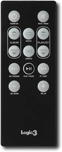 Controls located on remote include power, mute, next or previous album, repeat, shuffle, next or previous playlist, rewind or previous track, fast forward or next track, play, pause and volume