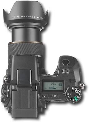Konica Minolta GT lens with 7x optical zoom; all-glass, apochromatic (APO) lens system designed for digital photography; 16 elements in 13 groups, including 2 AD glass elements to reduce flare, chromatic aberration and image distortion; manual zoom ring