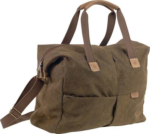 With a nylon interior, leather accents and brass fixtures and zippers offers a durable design.