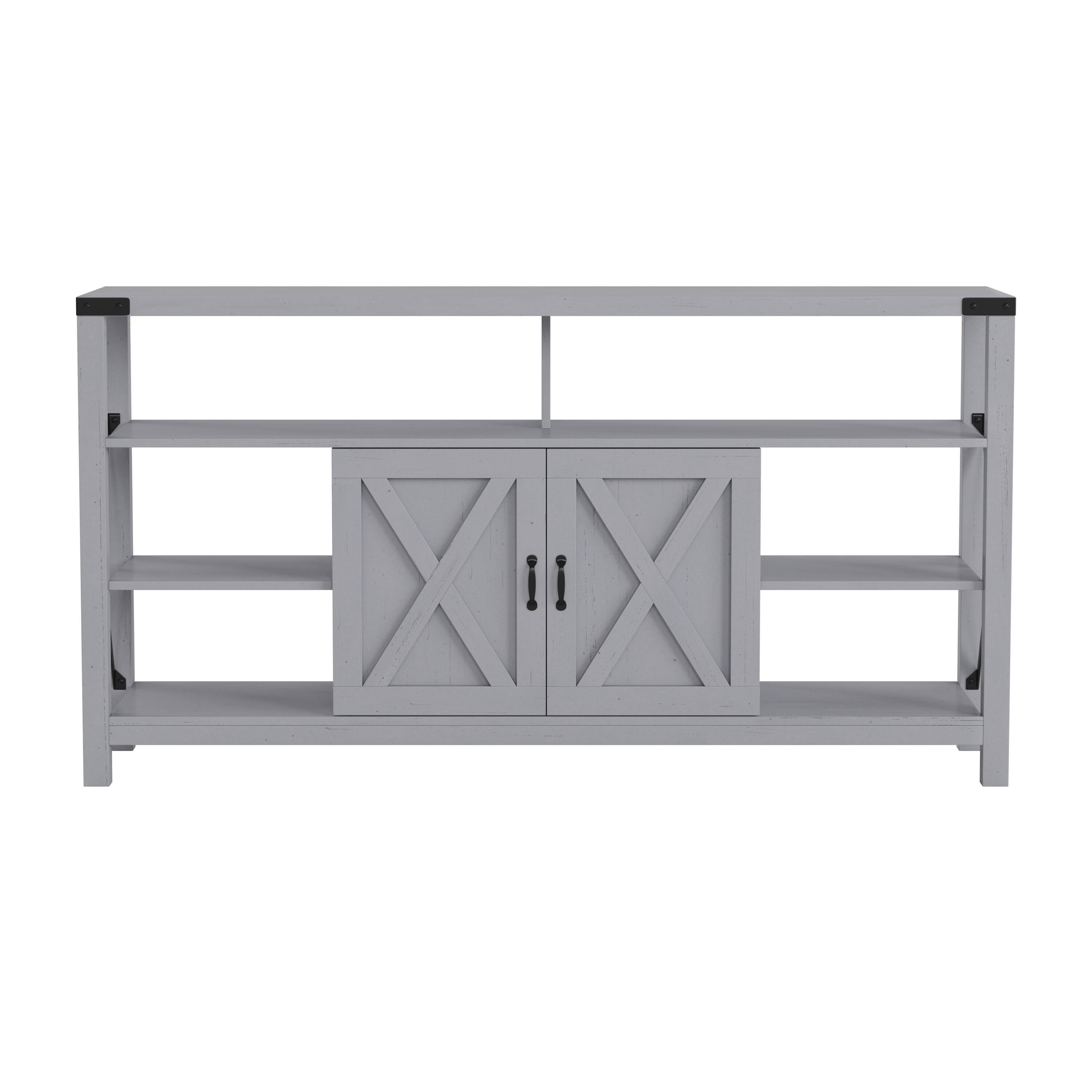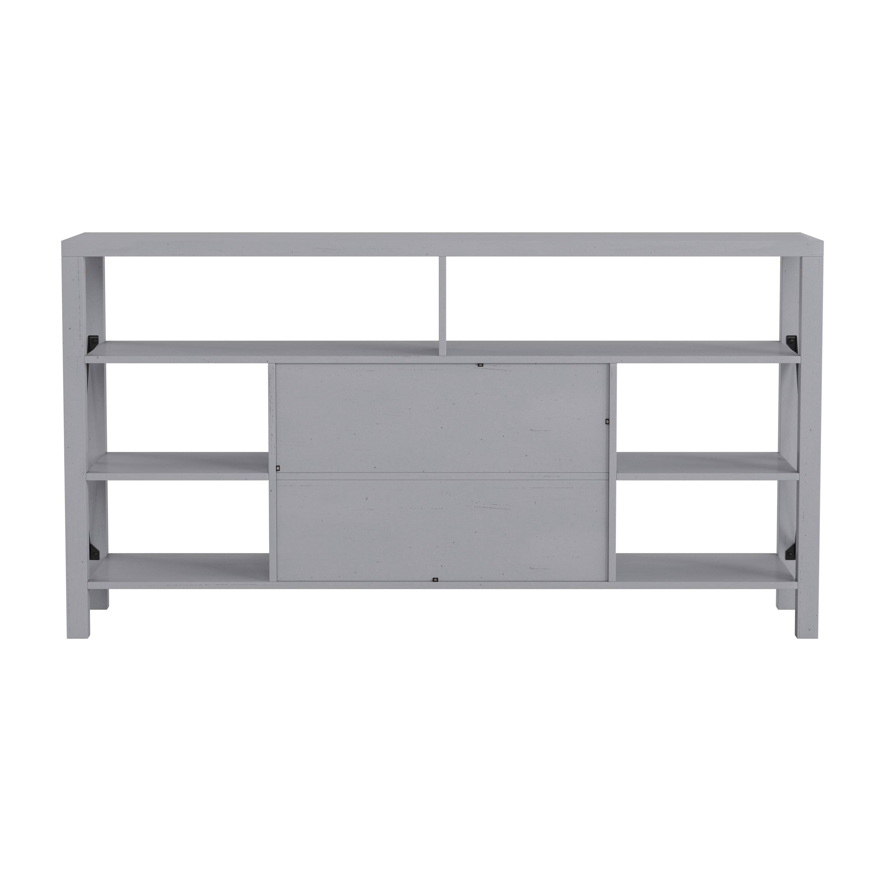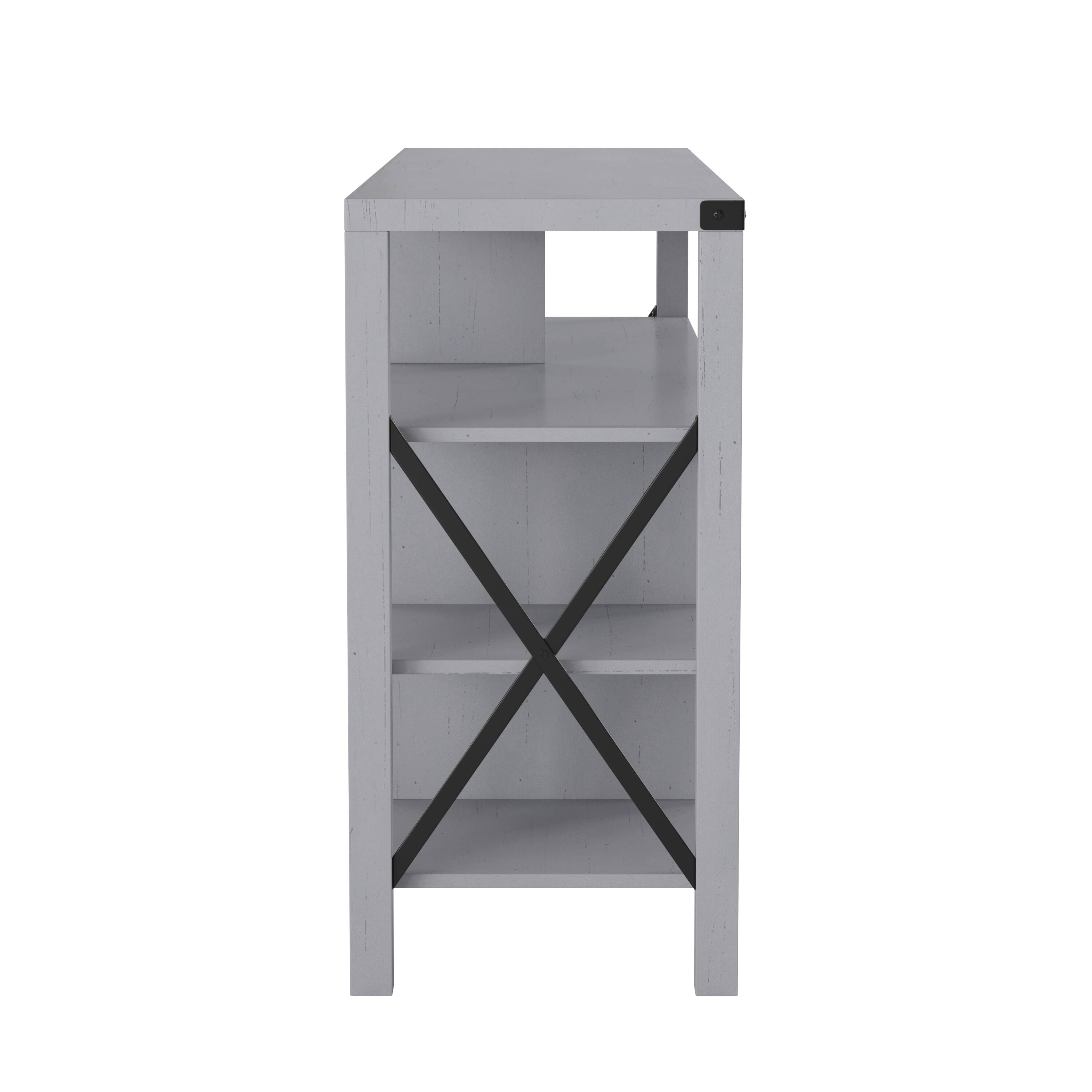 - A:Answer This modern farmhouse TV stand features both fixed open storage shelves and a storage cabinet with an adjustable shelf.