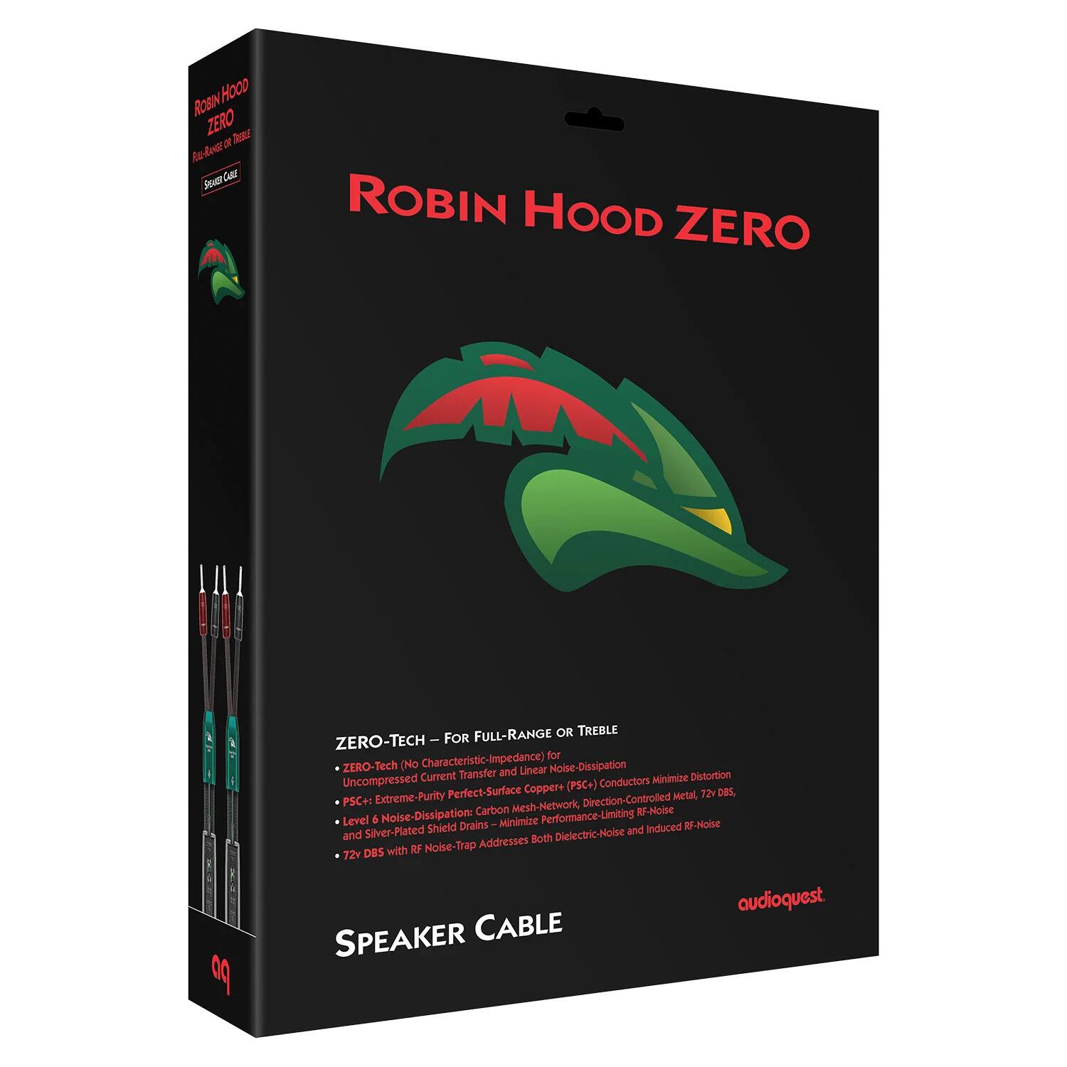 - A:Answer The ZERO-Tech technology in the AudioQuest Robin Hood ZERO Speaker Cable benefits audio quality by keeping the largemagnetic fields associated with bass energy out of the treble cable. This allows the delicate upper frequencies totravel a less magnetically disturbed path, resulting in clearer and more detailed sound. Additionally, the RF/ND-Tech(patented RF-Canceling Ground-Noise Dissipation) attracts RF energy away from the amplifier's output, further reducingdistortion and improving sound quality.