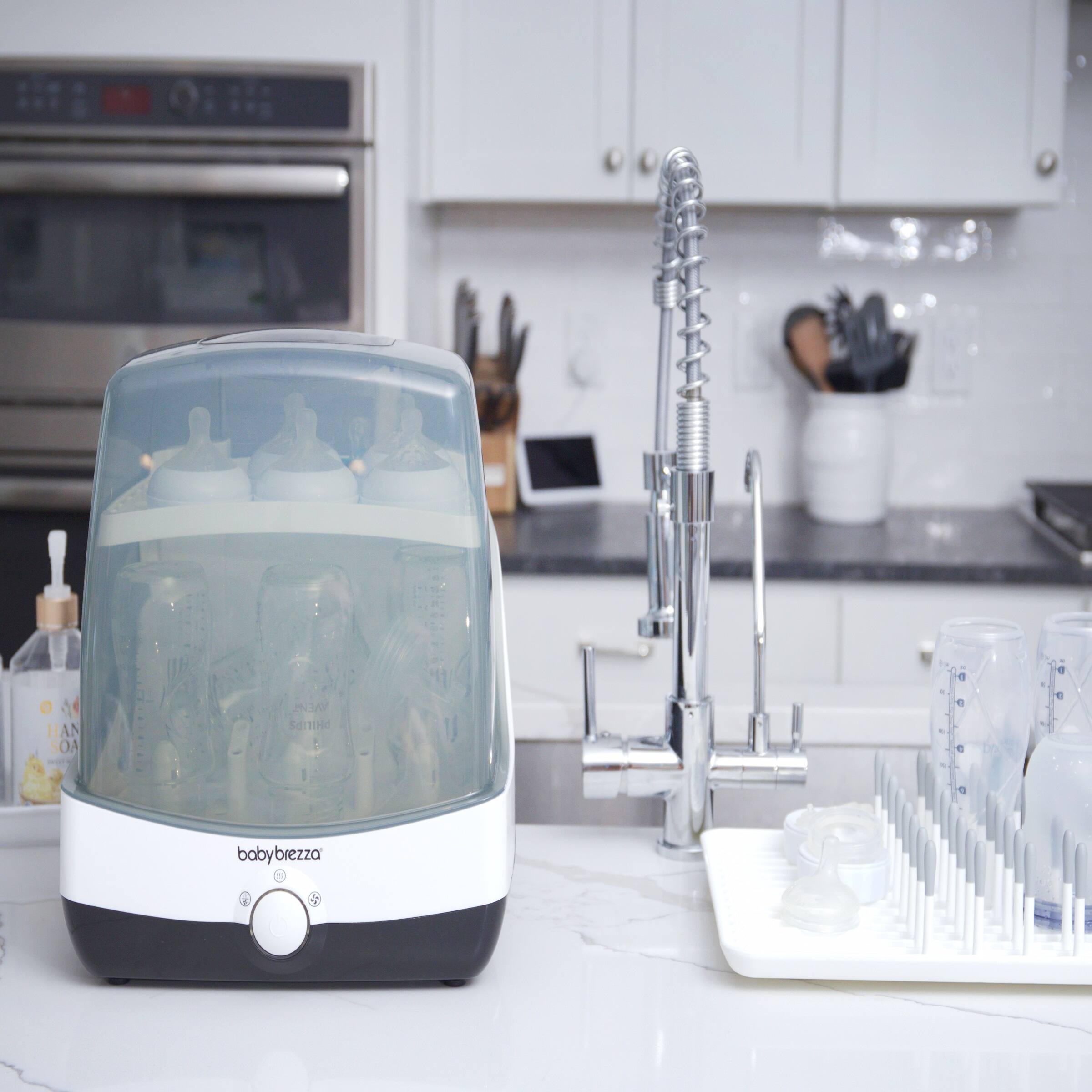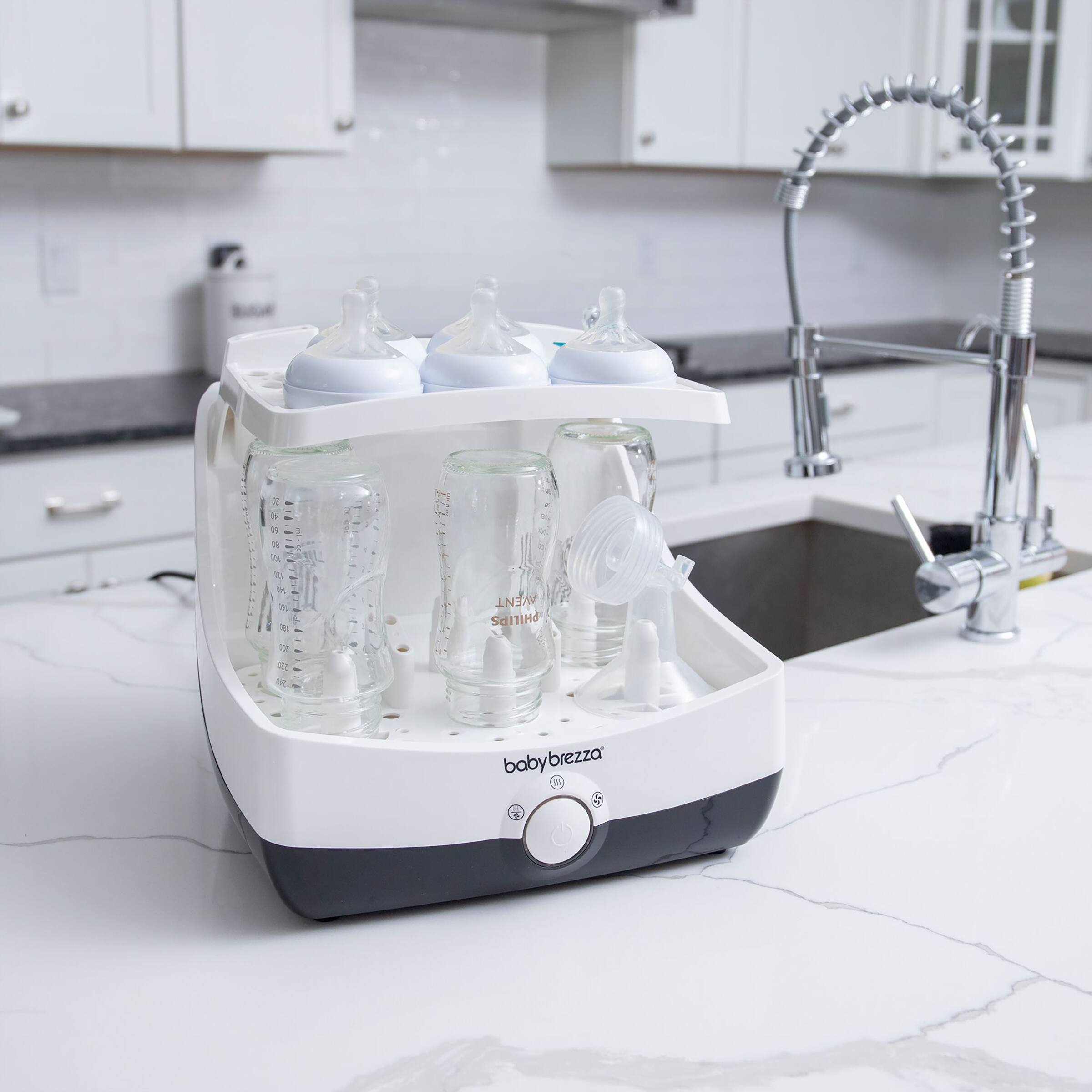 - A:Answer Thank you for your interest in our products. Only cleaned bottles and pump parts can go into the superfast sterilizer dryer. This machine is only capable of sterilizing and drying. It is not capable of washing. Should you require any assistance, please don't hesitate to reach out to our Customer Care team. Baby Brezza Customer Care