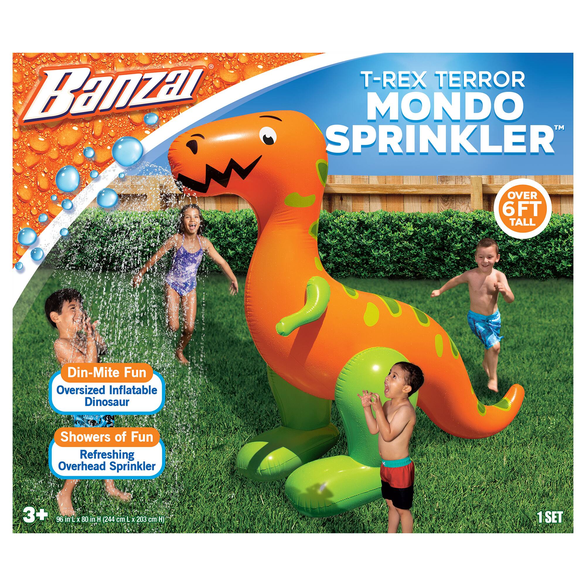 - A:Answer The minimum recommended age for using the Banzai T-Rex Terror Mondo Sprinkler is 3 years.