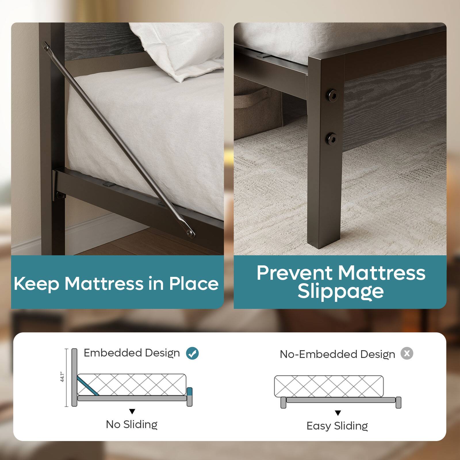 This question and answer was generated by AI based on customer and product data.QuestionWhat prevents the mattress from slipping on this bed frame?