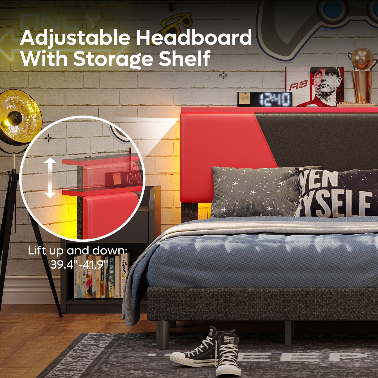 - A:Answer The storage shelf on the headboard can be adjusted in height.