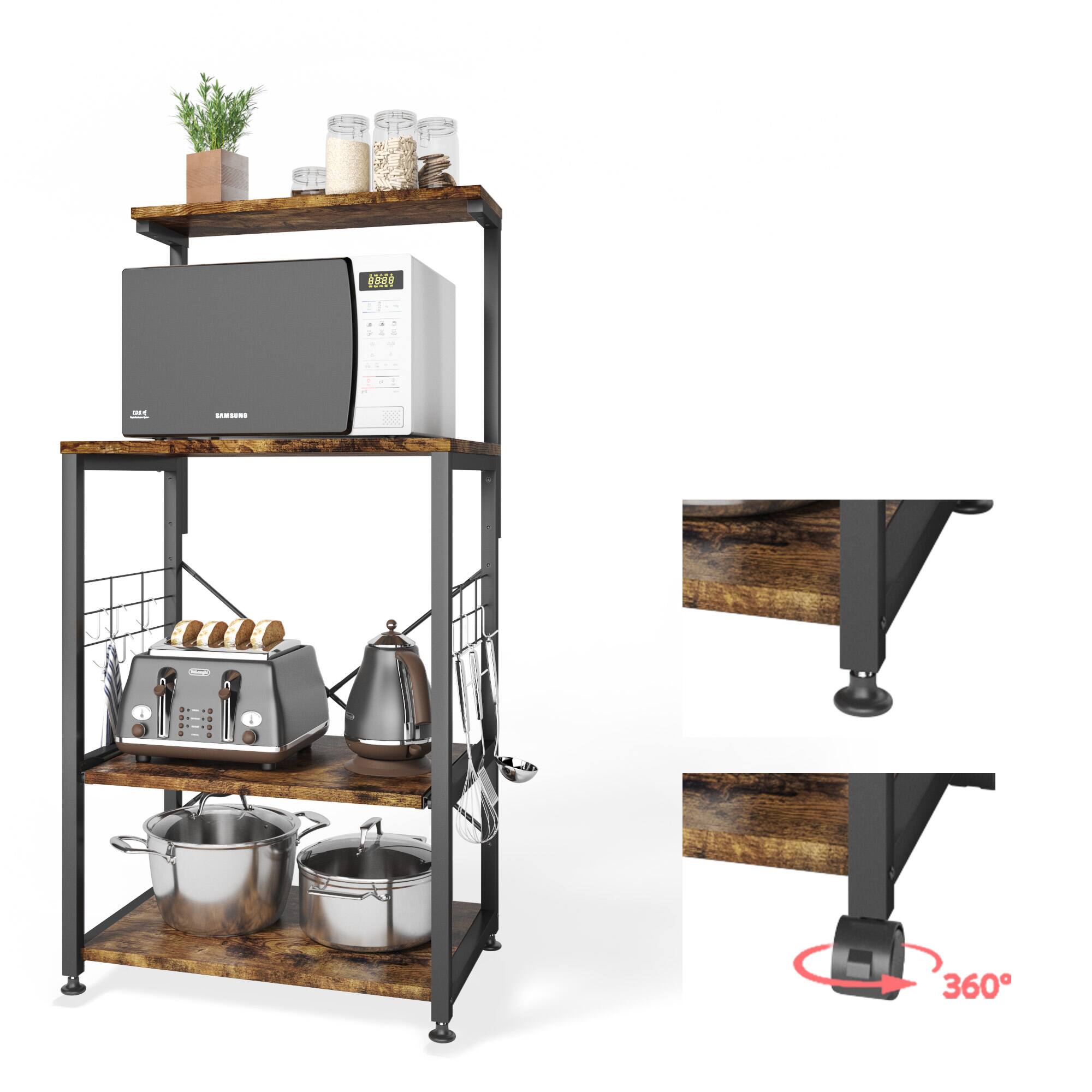 - A:Answer This baker's rack has four separate tiers to help you keep all of your kitchen essentials organized and within reach.