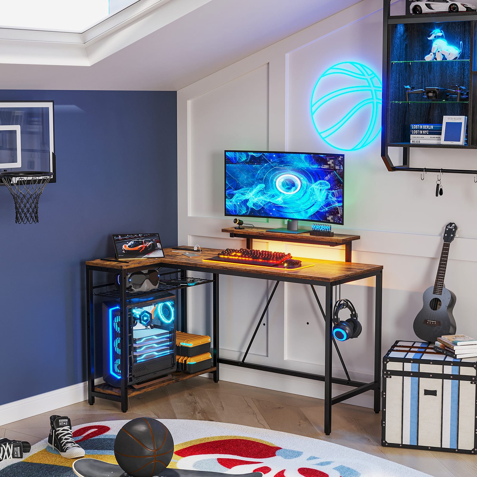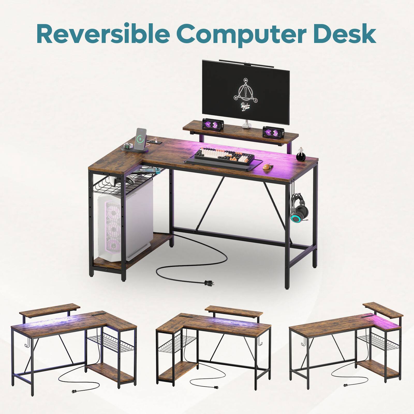 This question was asked about the related product: Bestier - L-Shaped Computer Gaming Desk with LED Lights, Power Strip, Monitor Stand, Charging Station & Adjustable Storage - 52" Black Carbon Fiber