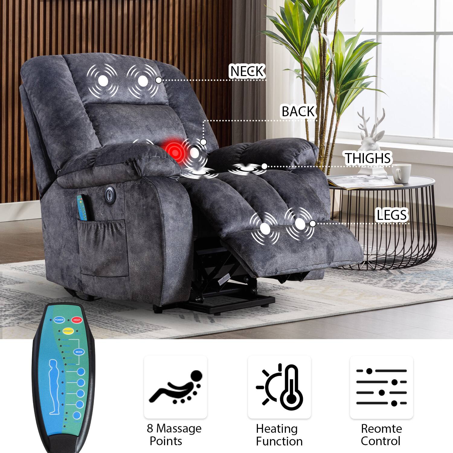 - A:Answer The recliner has eight massage points.