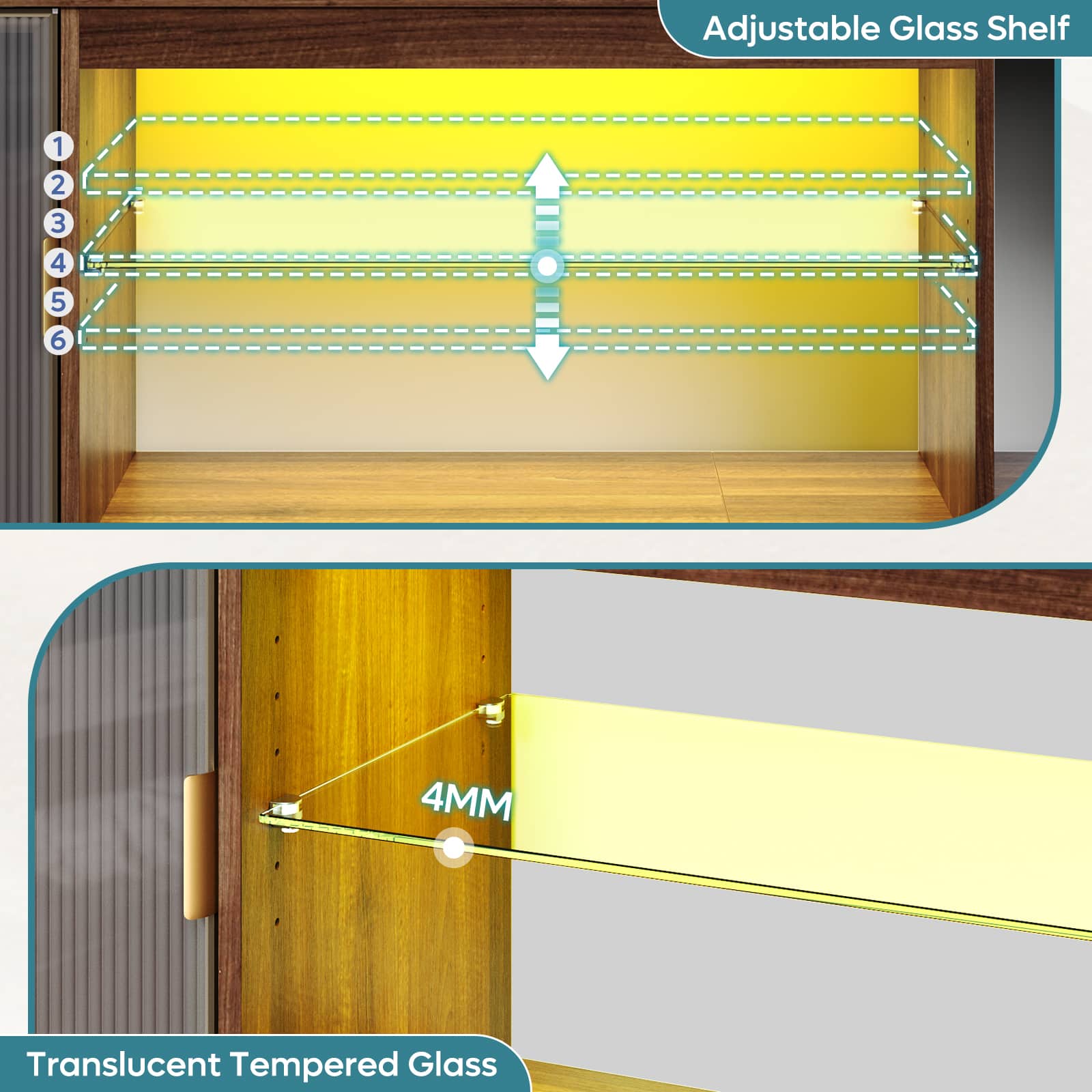 - A:Answer The LED light strips can change colors to suit different needs and enhance the ambiance of a room. They are especially amplified by the glass shelves, which reflect the light.