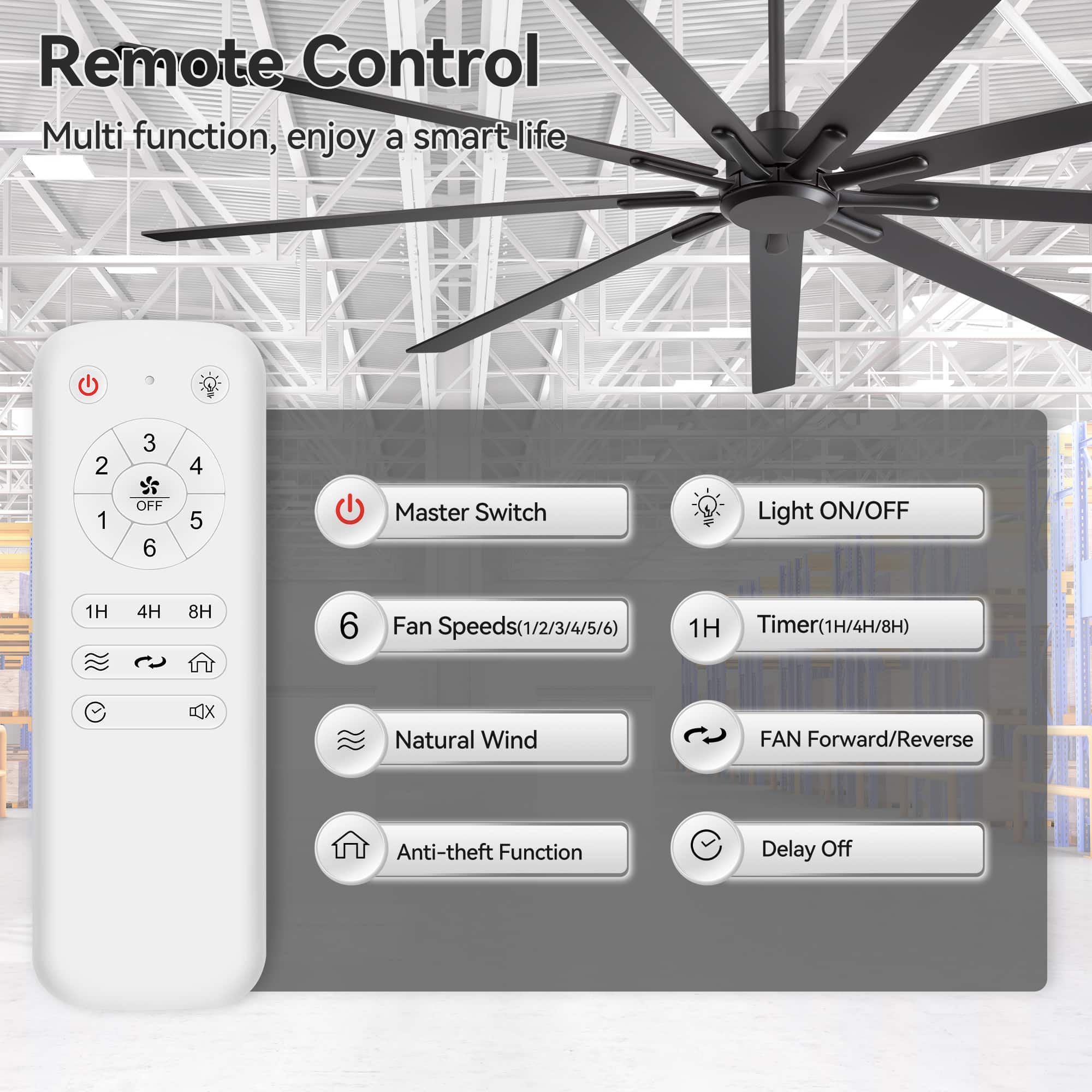 - A:Answer Hi, Yes — this 84" Breezary ceiling fan does come with a remote control, and all functions are operated by the remote. If you need any help or have more questions, feel free to let me know!