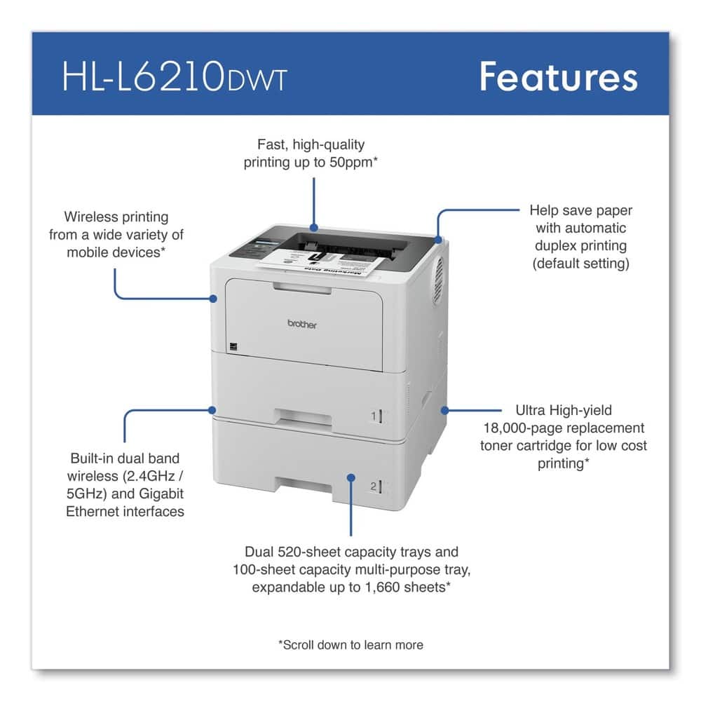 - A:Answer No, the Brother HLL6210DWT is not able to scan, copy or fax. The Brother HLL6210DWT is a printer only. Below is a link with the Brother HLL6210DWT specifications. Answer Link: https://support.brother.com/g/s/id/htmldoc/printer/cv_hll6415dw/use/html/GUID-27117FAE-7606-47CD-BA0E-5B4BF5E8C210_1.html?c=us&lang=en&prod=hll6210dw_us_eu_as