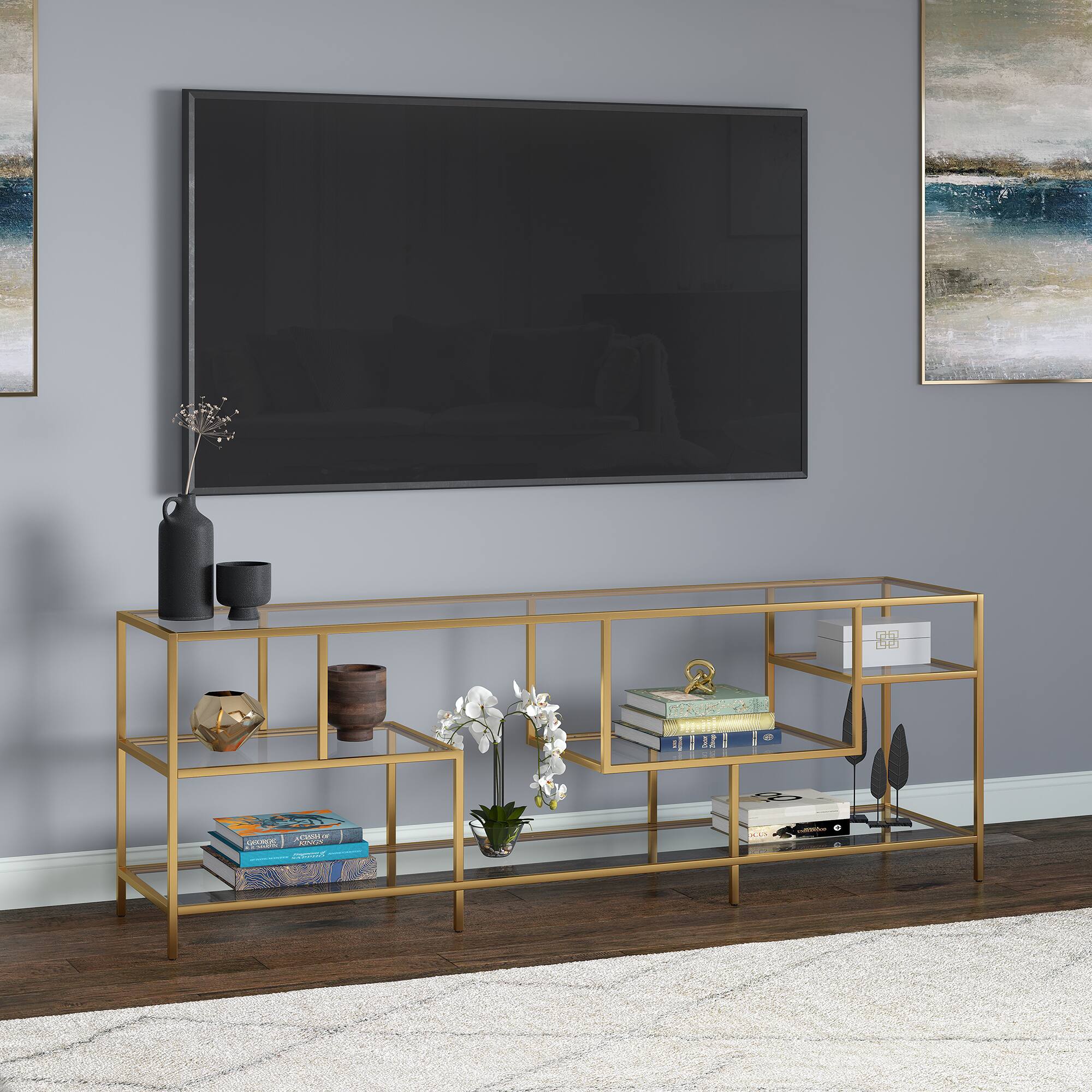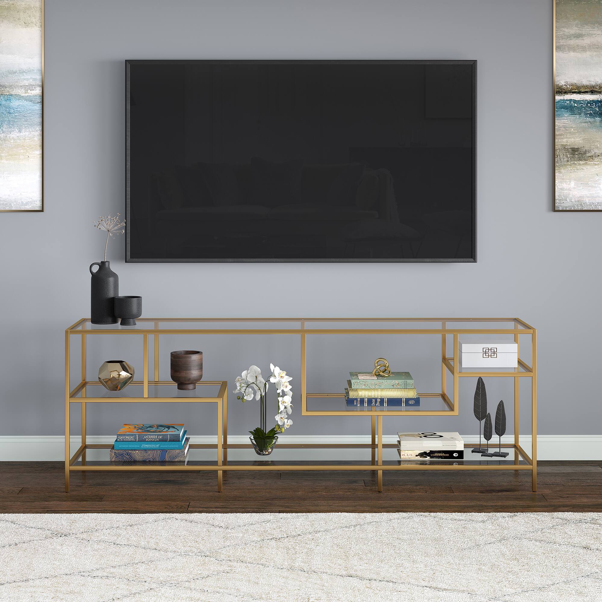 This question and answer was generated by AI based on customer and product data.QuestionWhat is the material of the tempered glass top and shelves on the Deveraux TV stand?