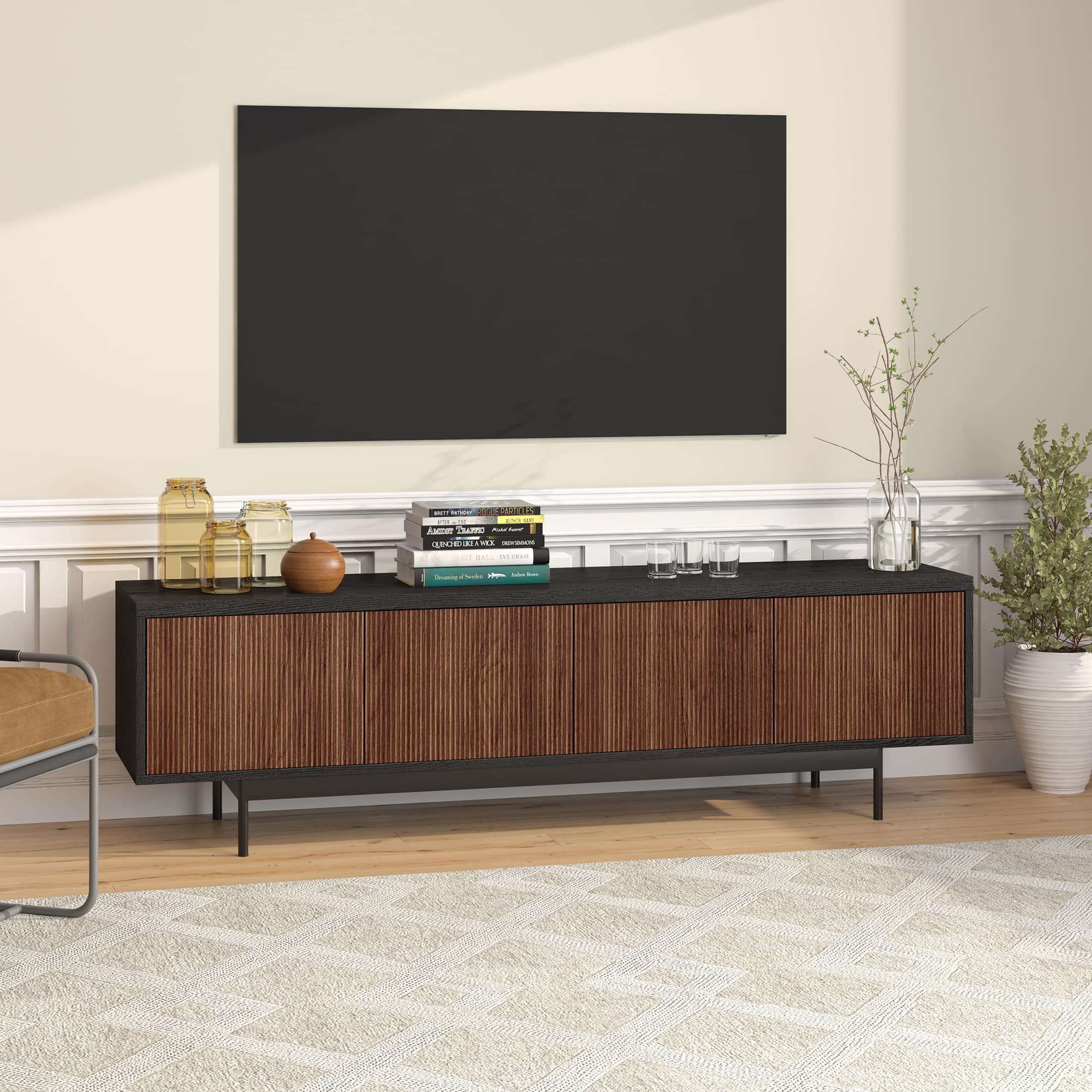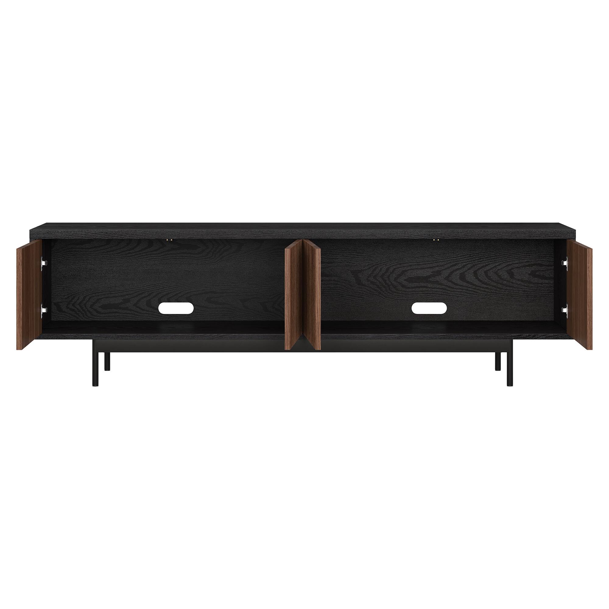 - A:Answer The open inside area of the TV stand allows for free-form storage of your devices, games, books, and more.