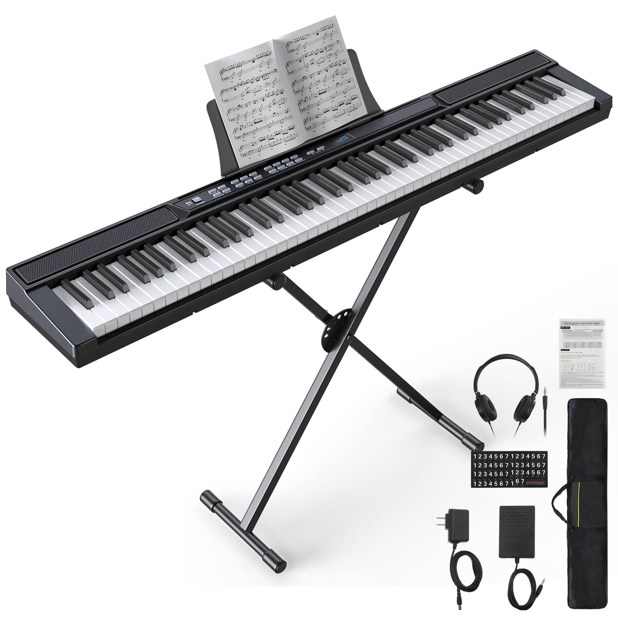 Q: QuestionDoes this come with everything in the picture - Keyboard, Keyboard stand, and the pedals that are on the bottom? And, the cover to pull over the keyboard keys to prevent dust when not in use?