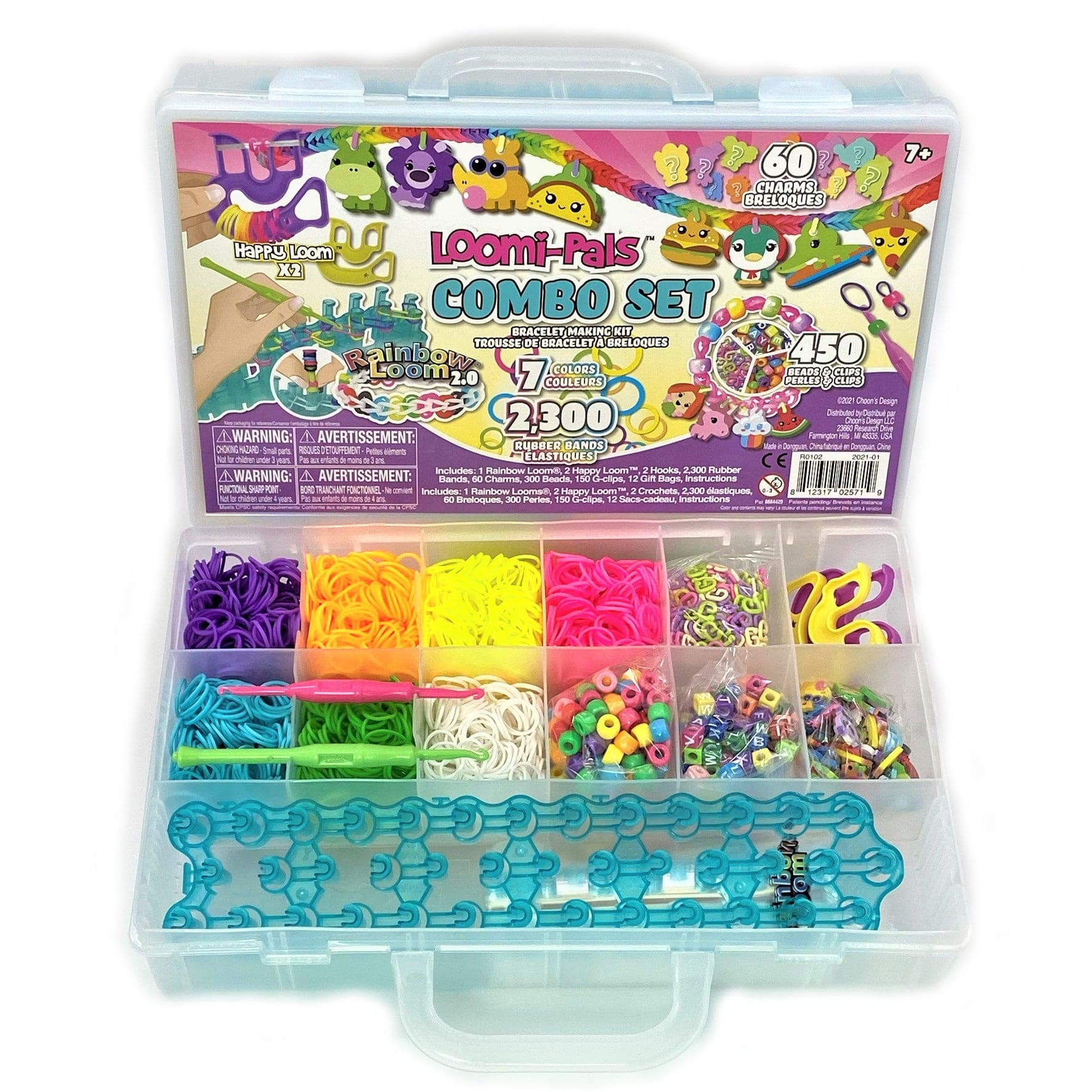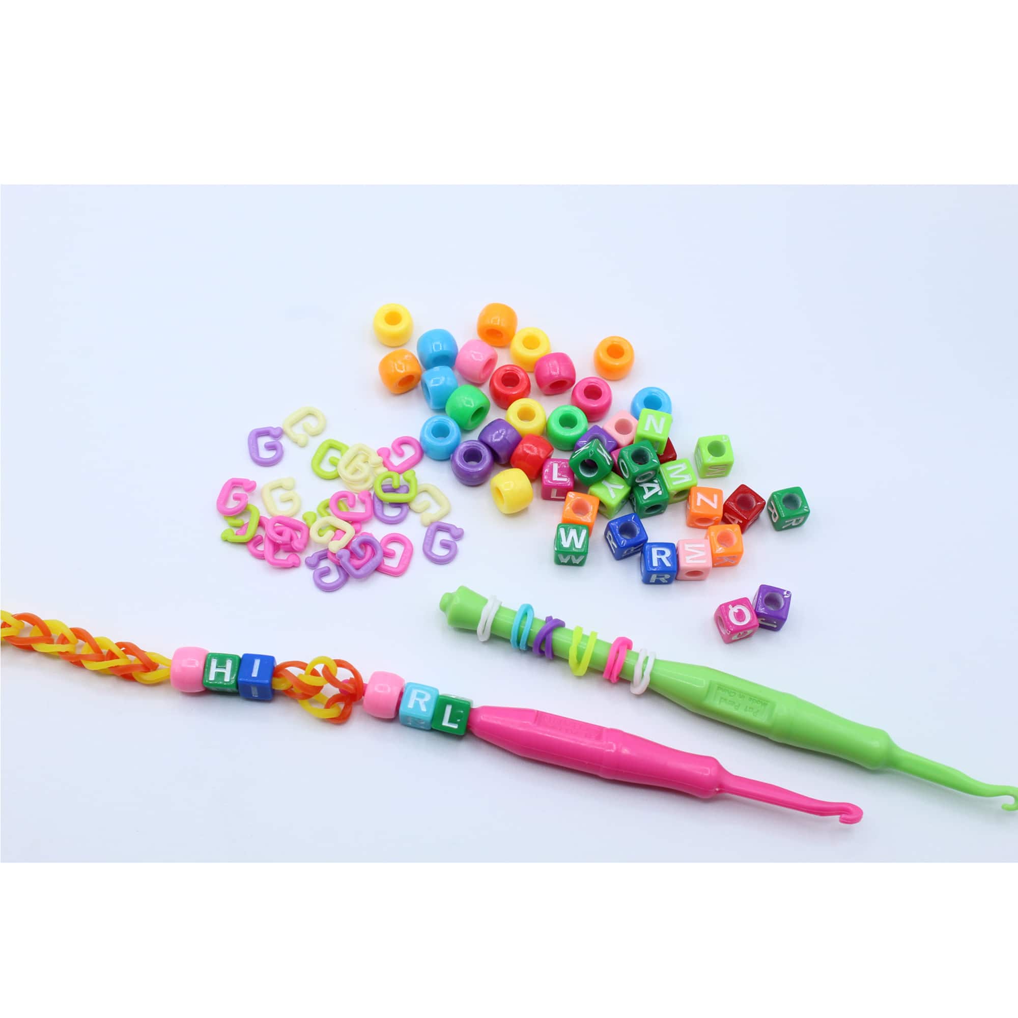 - A:Answer This kit includes 2,300 bands, 150 G-Clips, 60 Charms, 300 beads, two happy looms, 12 gift bags, and a carrying case with multiple compartments.