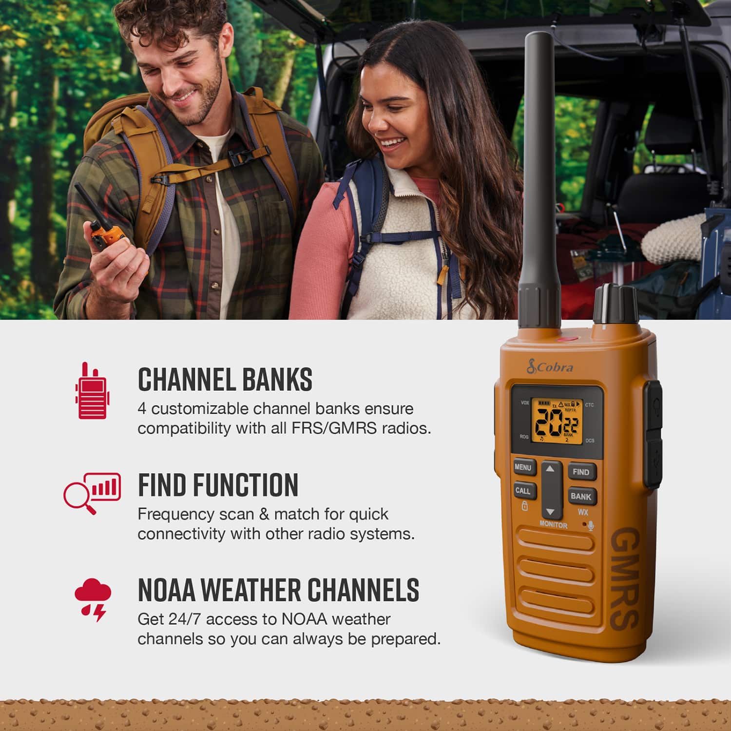 - A:Answer It supports 30 GMRS channels and has 4 customizable channel banks for compatibility with all FRS/GMRS radios.