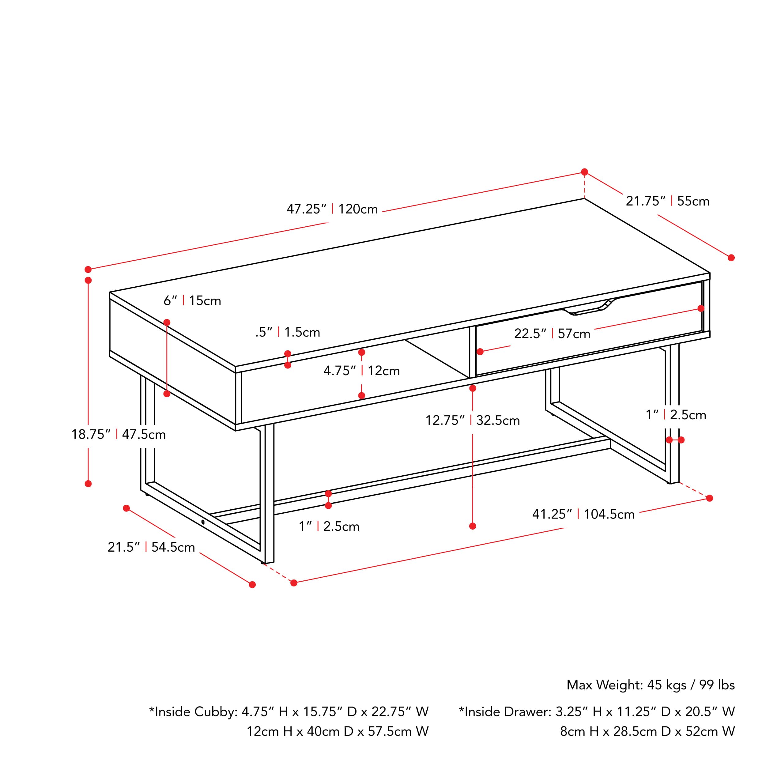 - A:Answer The coffee table has a width of 47 inches, a height of 19 inches, and a depth of 22 inches.