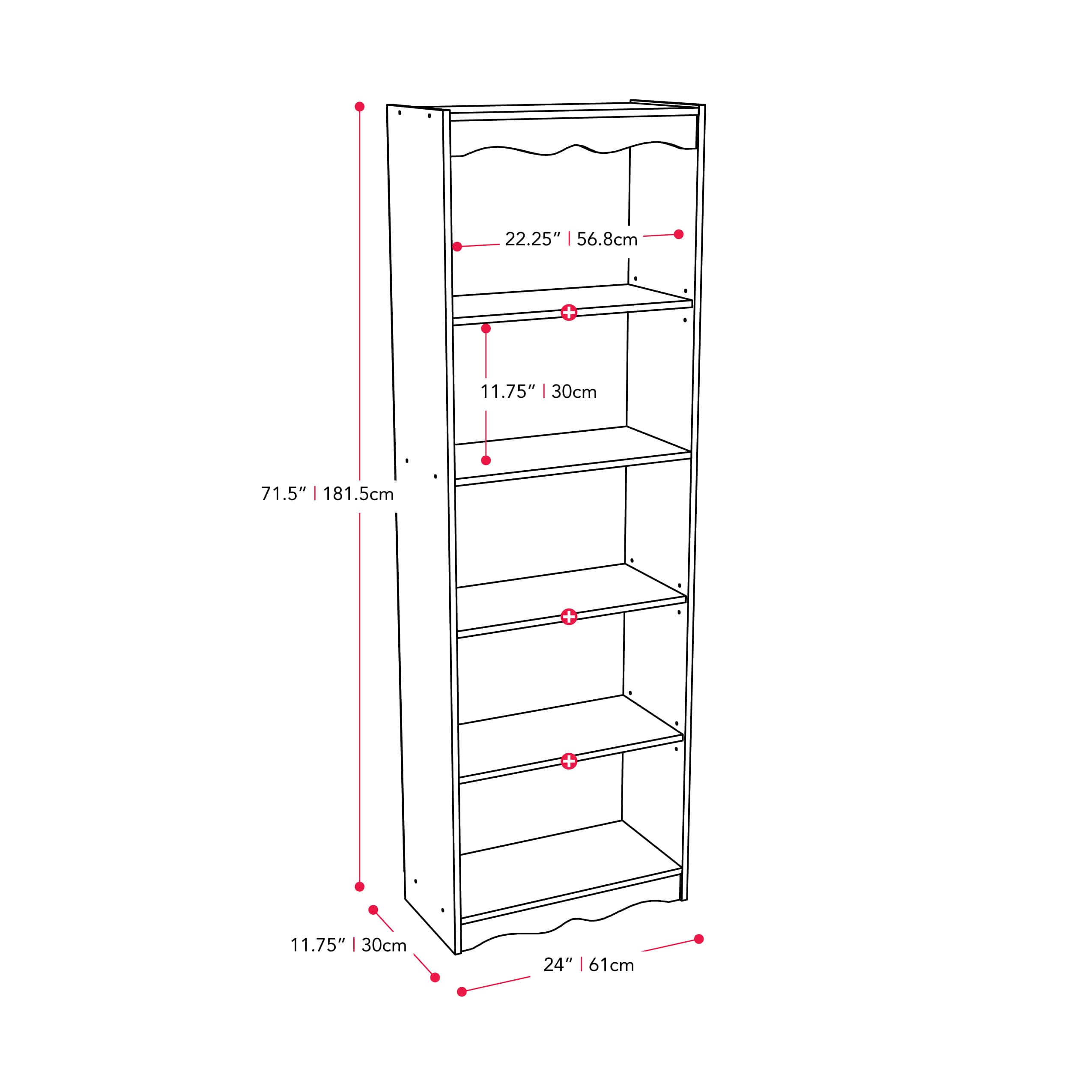 - A:Answer The bookcase is 72 inches tall, 25 inches wide, and 12 inches deep.