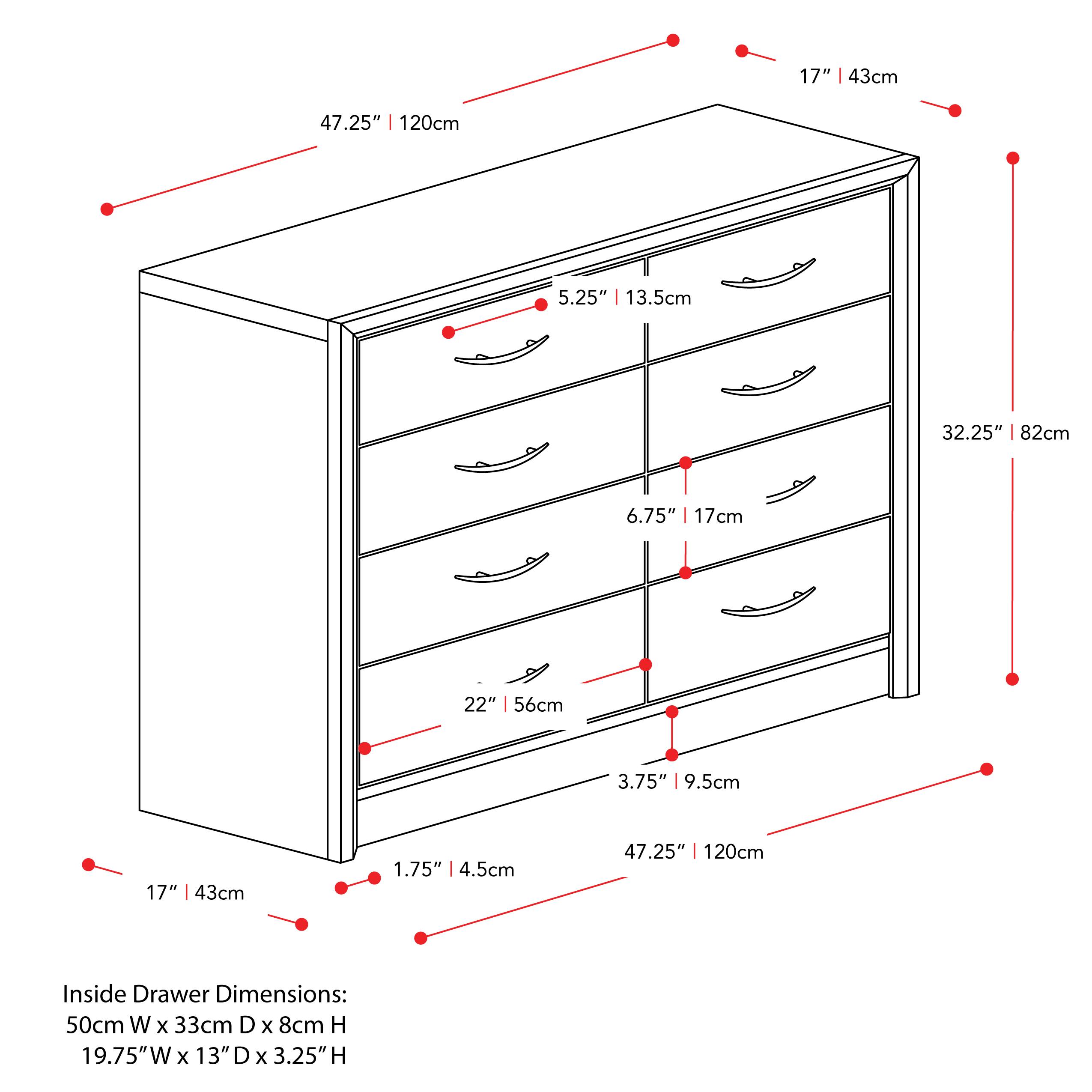 - A:Answer The Newport 8 Drawer Dresser is 32 inches high, 47 inches wide, and 17 inches deep.