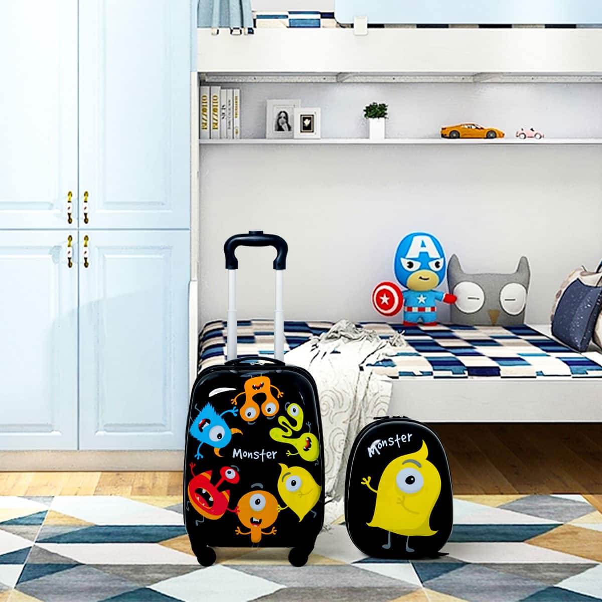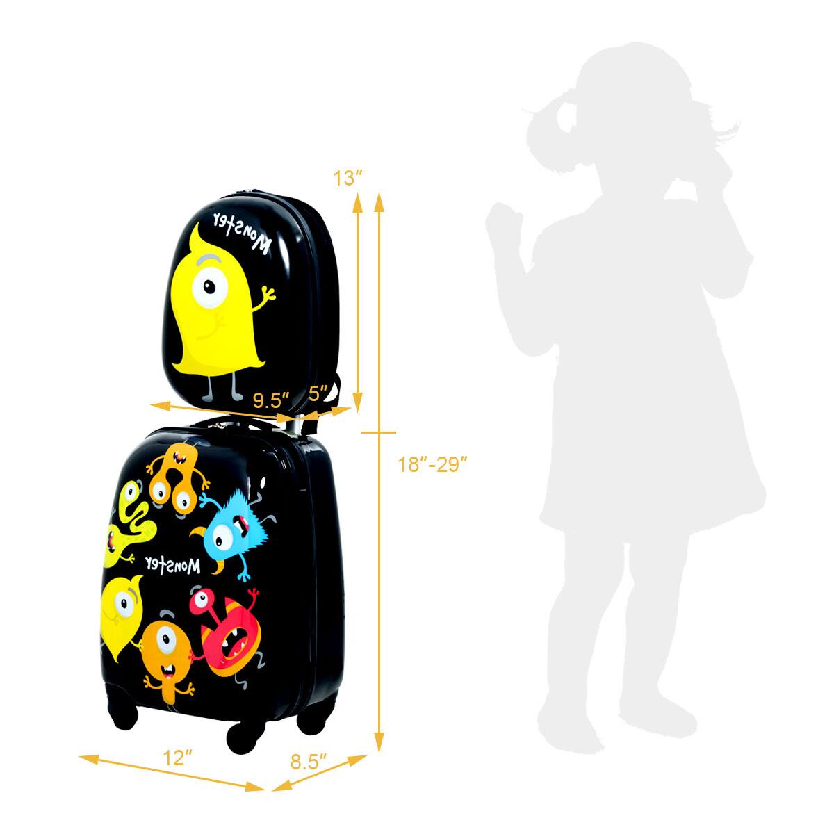 - A:Answer The luggage set features adjustable handles and straps, durable and wear-resistant ABS and nylon materials, and eye-catching monster patterns that children will love.
