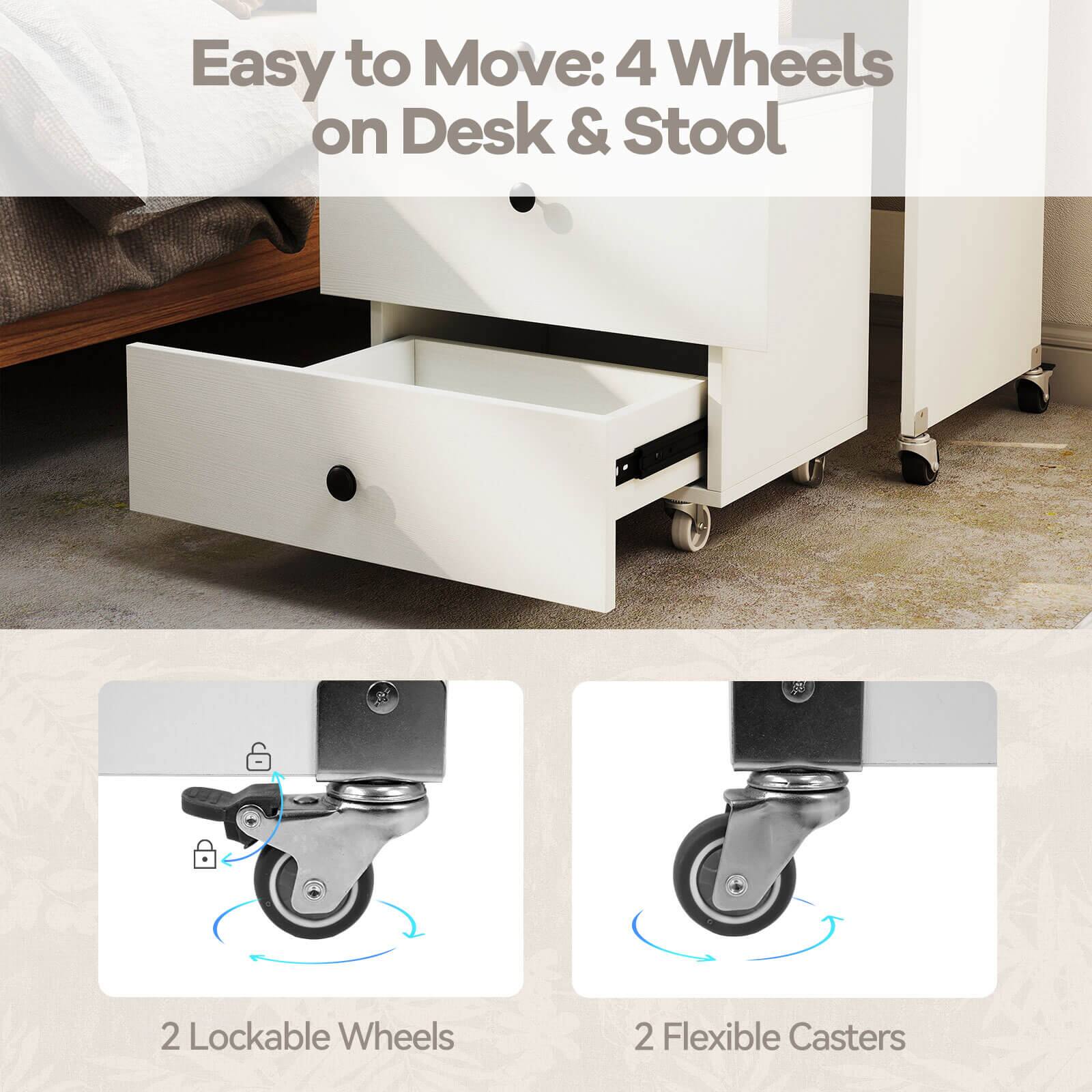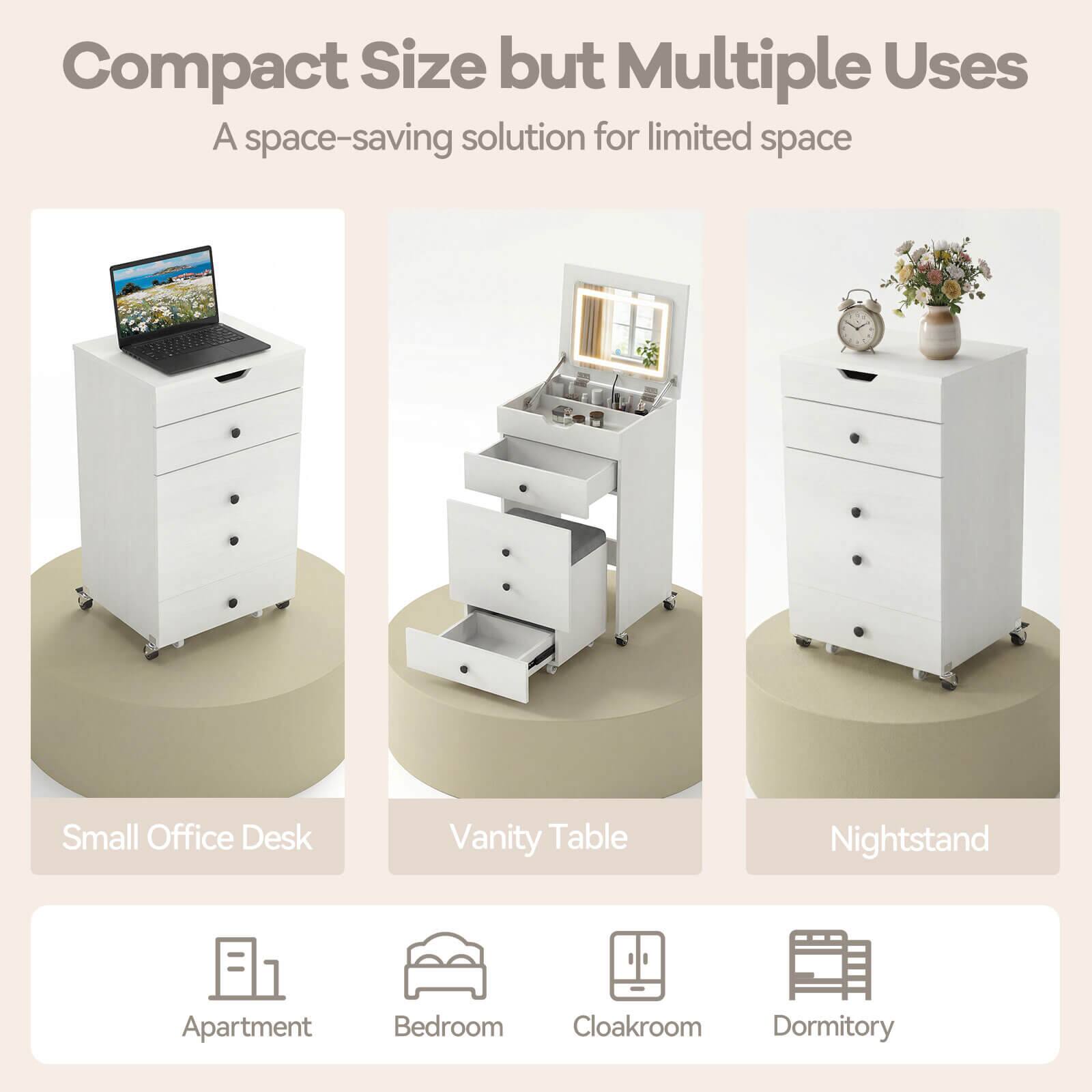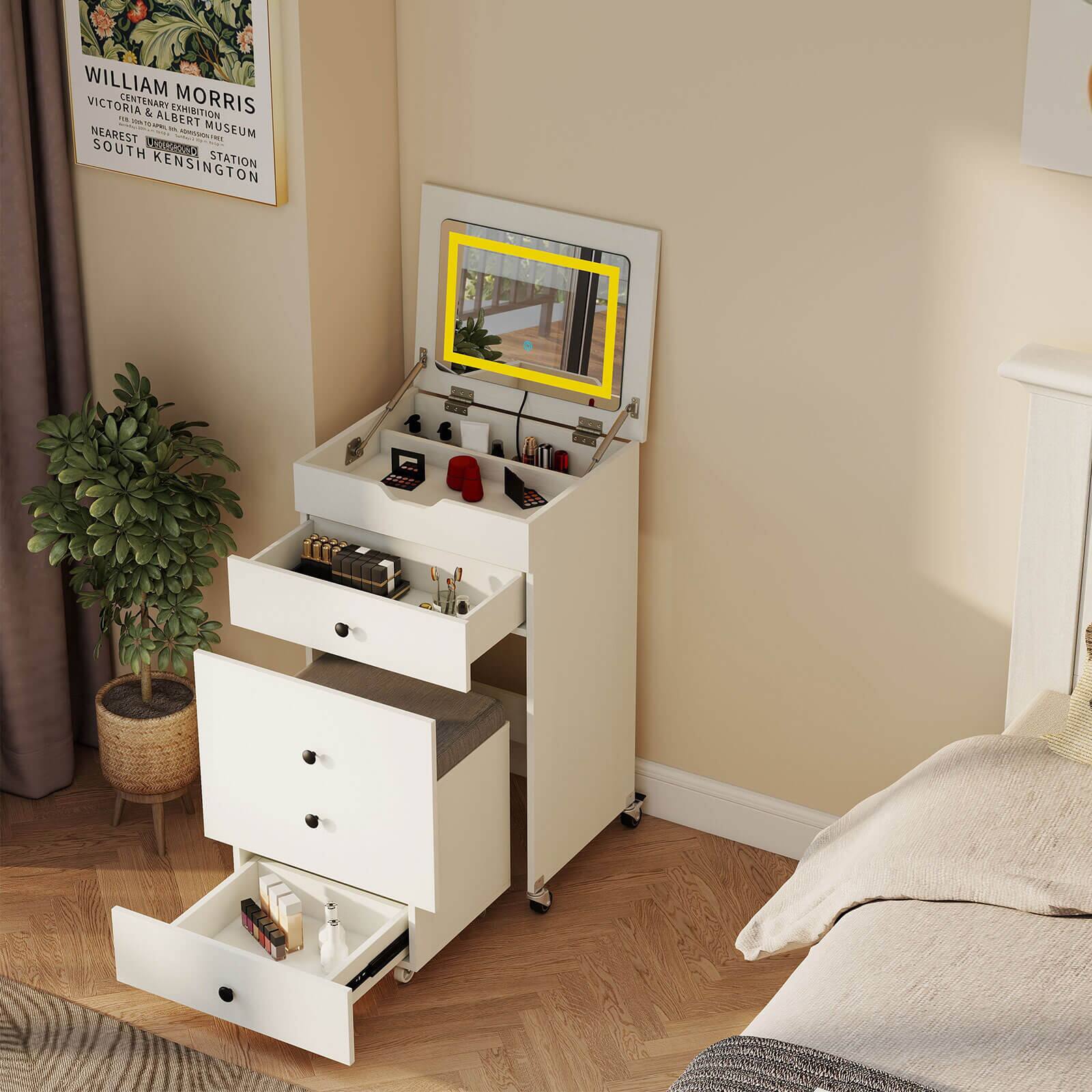 Costway - 3-in-1 Small Vanity Desk Set with Flip-top Mirror, Lights, Drawers, Storage Stool - White
